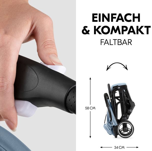 kolečka pěnová (otočná s možností fixace) • téměř úplný rovný leh (165°) • prostorná sedačka • velmi lehký • velmi skladný • složení jednou rukou • zadní kolečka ⌀15.5 cm • hmotnost kočárku 7.9 kg • nosnost sedačky 22 kg • šířka kočárku 51 cm