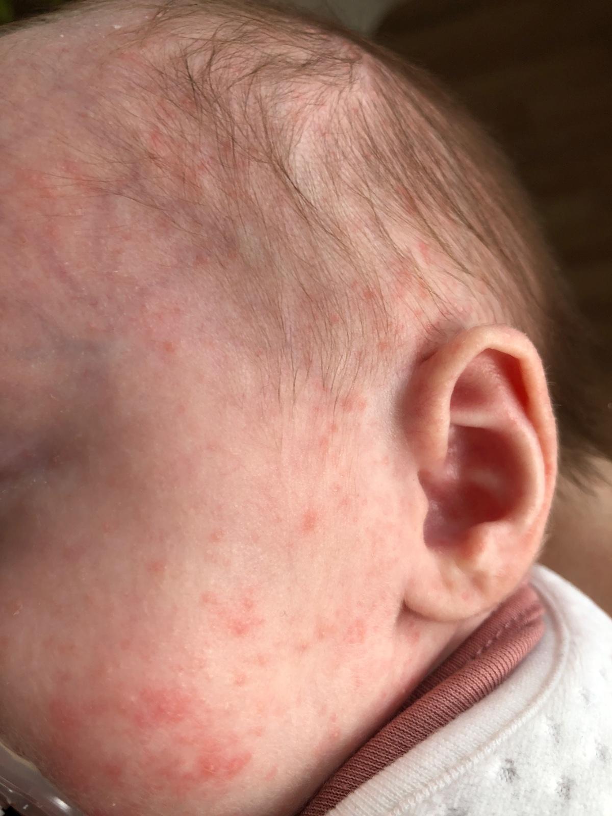dceři (čerstvě měsíční) se objevila vyrážka. Už ji trápí déle, ale byla nárazovitá, chvilku světlejší/tmavší. Začala na čele mezi očima, postupně se přesunula na tváře a nyní je již trochu i ve vláskách, na krčku a maličko nahoře na hrudníku. Mezi očima se jí udělaly žluté stroupky.