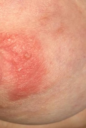 kolem bradavky mám podivnou červenou kůži, která má půlměsícový tvar. Celý prs je svědivý a mám v něm nepříjemný pocit.
