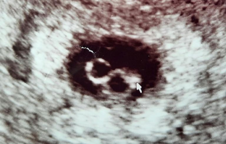 Embryo vpravo má 4,5 mm a srdeční akci, maličké embryo vlevo srdeční akci nemá. Ultrazvuk pořízen cca 7+3, ale velikostně vitální embryo odpovídá méně.