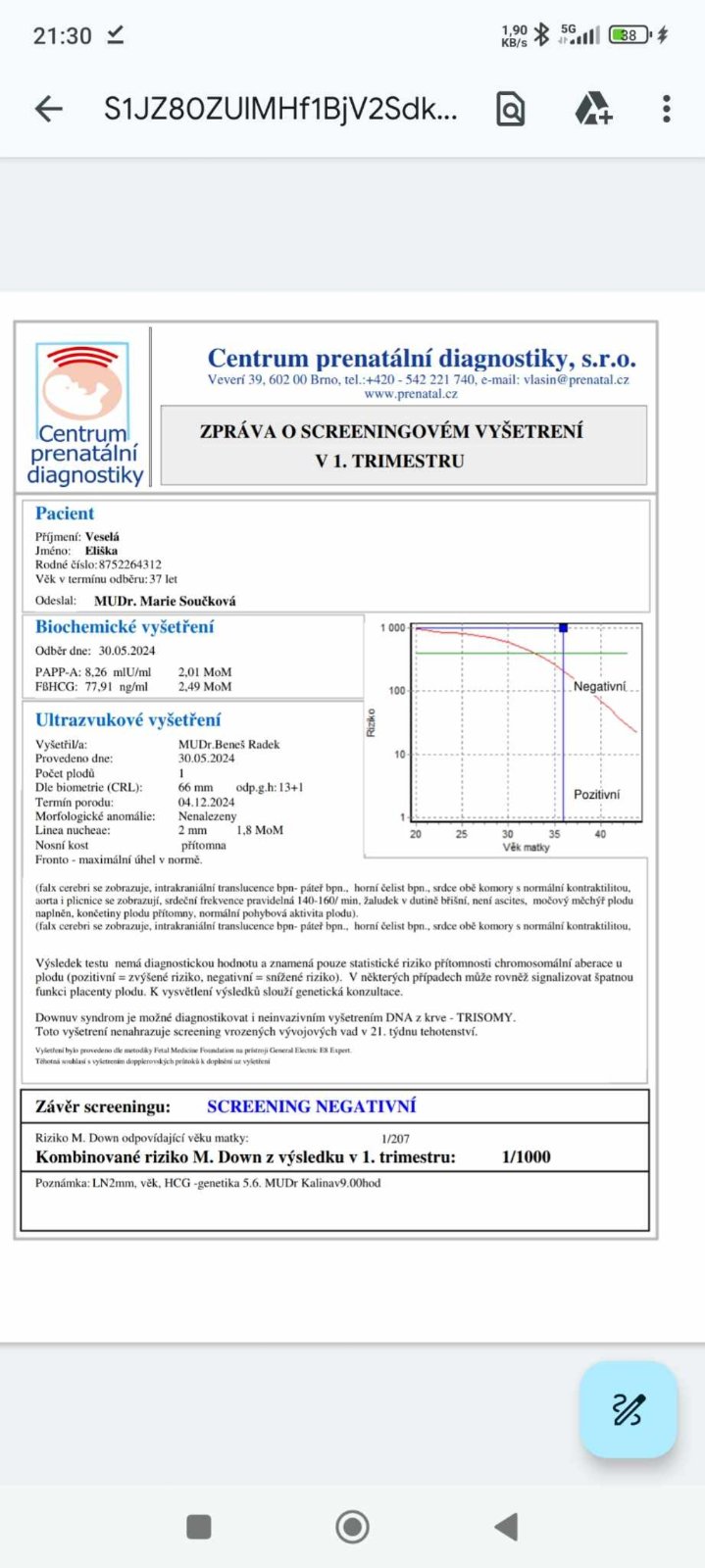 omlouvám se, ale kvalita obrázku velmi špatná, nedokáži vše zřetelně přečíst a podrobně probrat výsledek screeningu nejde pomocí několika vět, interpretace může být individuální v závislosti na dalších údajích, které ze zprávy nevyčteme. Vysvětlit adekvátně výsledek vždy náleží tomu, kdo vyšetření provádí a předává Vám zprávu.