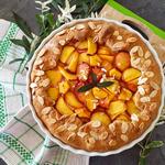 🌿 Okraje těsta přehneme přes nektarinky a posypeme je půlenými mandlemi