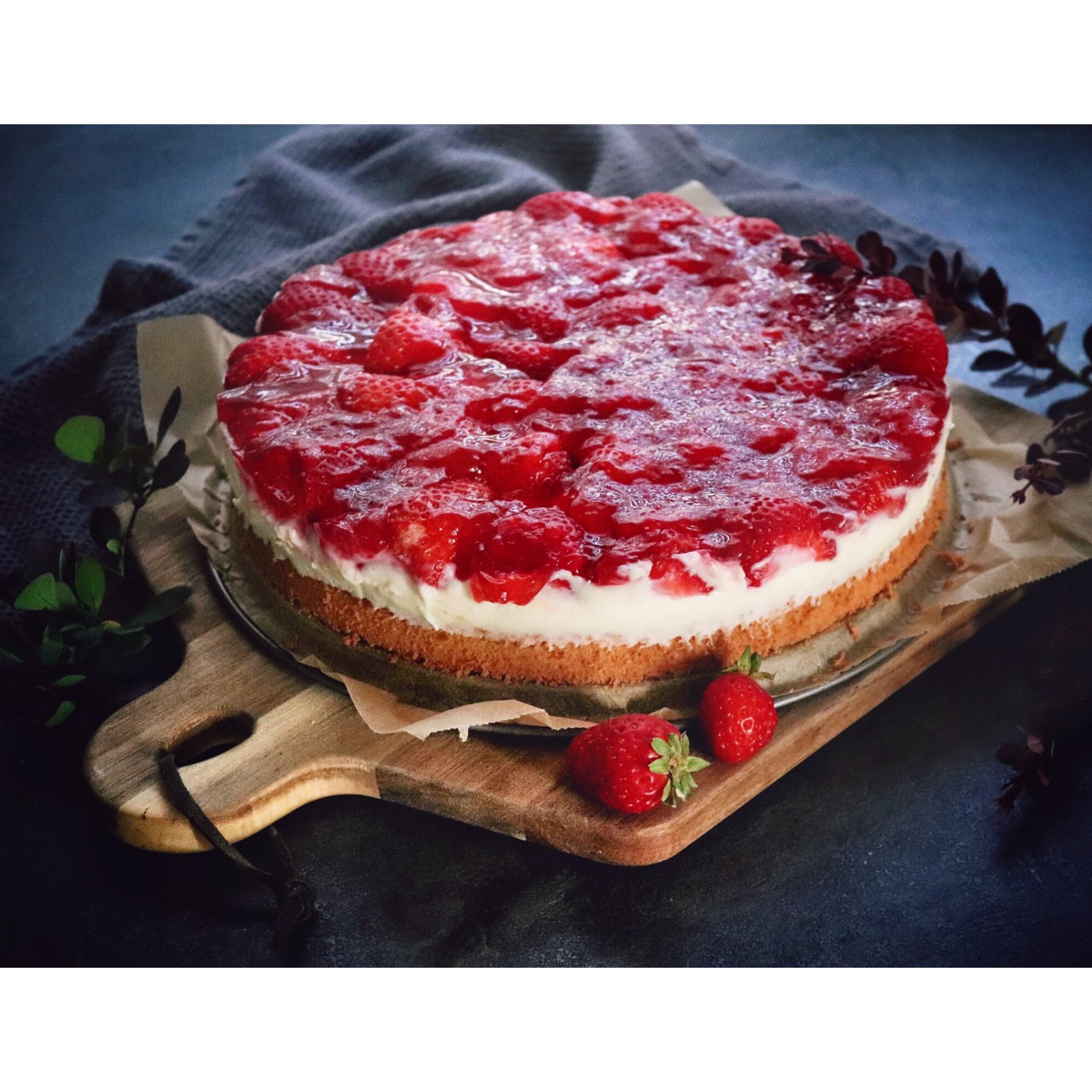 Na vychladlý korpus naneste studený krém (můžete dát společně ještě na chvíli do lednice). Na krém navršrte jahody po půlkách a zalijte dortovým želé. Dejte dochladit do lednice.