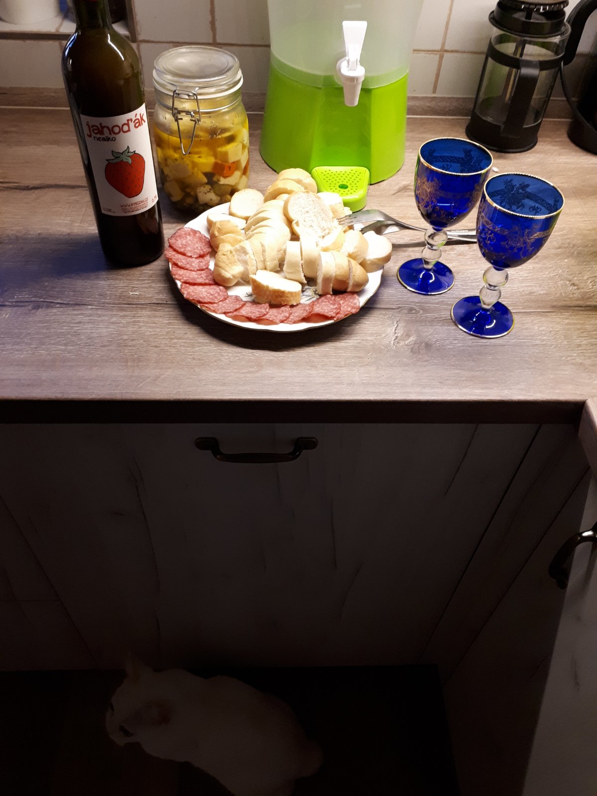 Spis neu upekli, uvarili, tak jsme nalozili. Pekne nakladany syr (ruzne druhy). Takto si uzivame, kdyz deti usnou 😀 rohlik je domaci 😀 a zelena je tam oliva, flaska i zasobnik 🤣