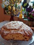 Přendáme krásně nakynutý bochánek na plech, pomažeme rozkvedlaným vejcem, posypeme mandlemi a pečeme 15 minut na 190 °C a poté cca 30 minut na 160 °C. Zkouška špejlí.