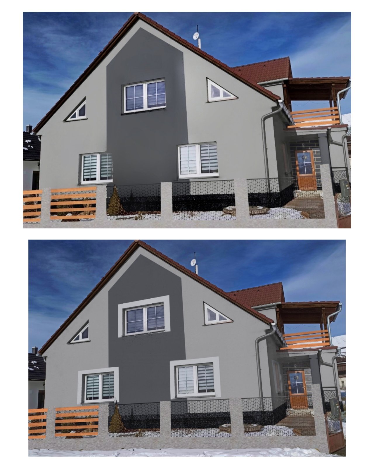 Pokud trvate na dvoubarevné fasádě, tak ja bych určitě nedělala ty bílé rámečky kolem oken. barvu buď šedou a když hnědou, tak něco svetlejsiho.