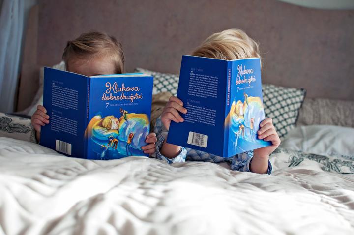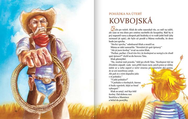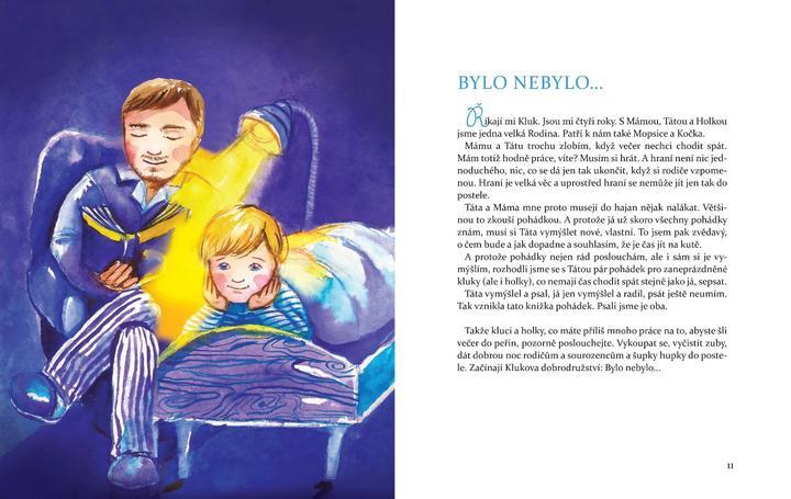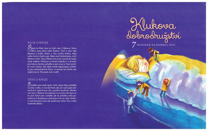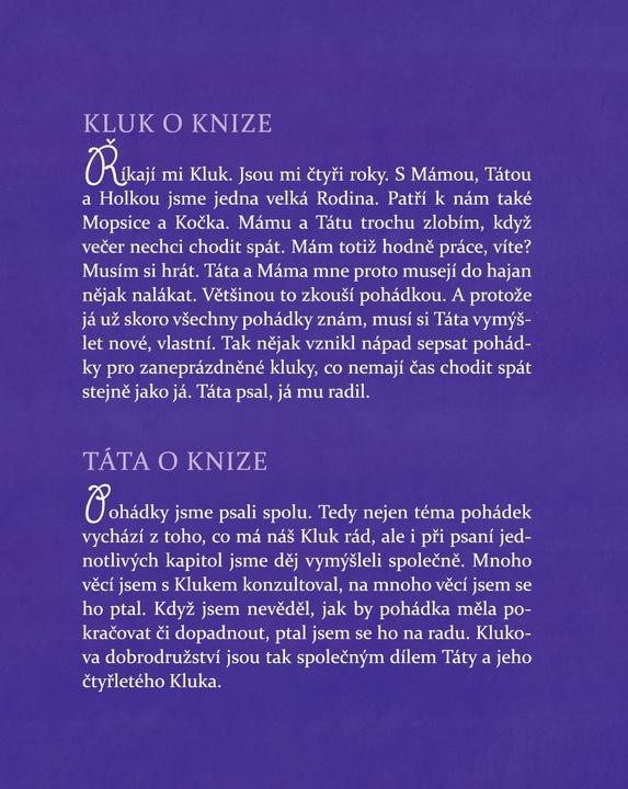 “Taky máte Kluka či Holku nebo oba a chcete je vyblejsknout? Máma to umí skvěle. A taky nechtějí chodit večer spát jako já a ségra? Přečtěte jim pohádku. A když už všechny znají, vymyslete novou. To zase umí Táta – píše a vydává pohádky. U nás si určitě vyberete…” (Kluk, 5 let)