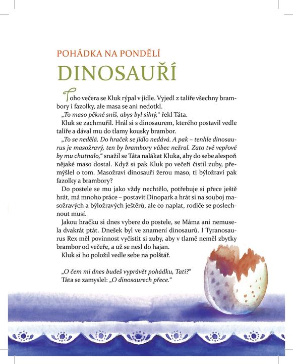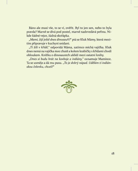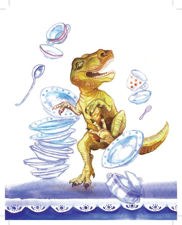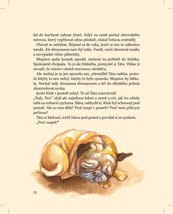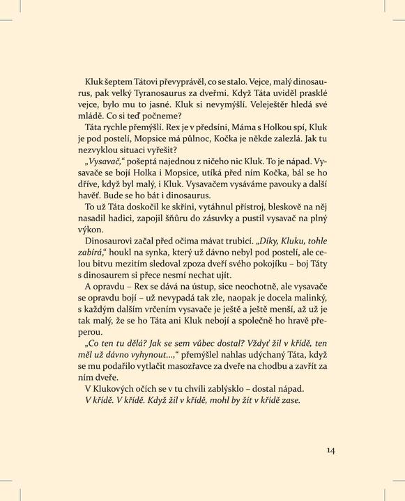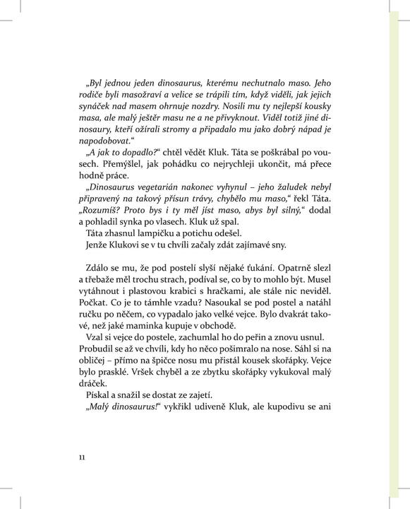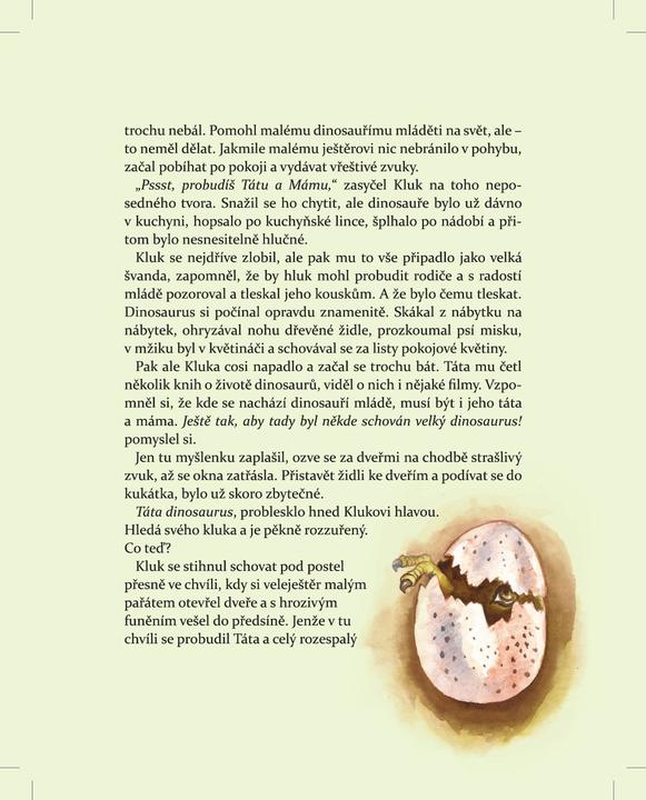 “To se nedělá. Do hraček se jídlo nedává. A pak – tenhle dinosaurus je masožravý, ten by brambory vůbec nežral. Zato tvoje vepřové by mu chutnalo,” snažil se Táta nalákat Kluka, aby do sebe alespoň nějaké maso dostal. Když si pak Kluk po večeři čistil zuby, přemýšlel o tom. Masožraví dinosauři žerou maso, ti býložraví pak fazolky a brambory?