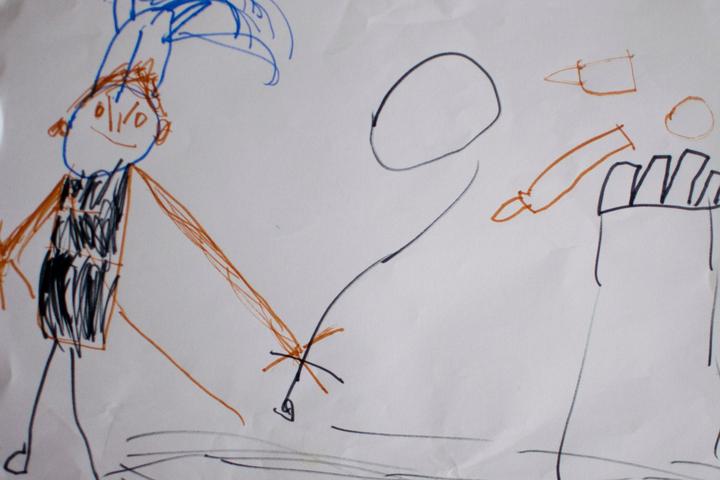 Kluk se zachmuřil. Hrál si s dinosaurem, kterého postavil vedle talíře a dával mu do tlamy kousky brambor.