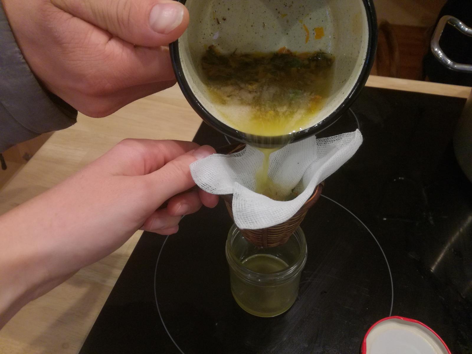 7. Druhý den si mast opět rozehřejeme a rozmícháme. Připravíme si čistý, umytý kelímek (já používám skleničku od jogurtu), musí být suchý. Mast do něj přecedíme přes jemné sítko nebo gázu. Tím zvýšíme její trvanlivost. Kusy čerstvého měsíčku by v masti mohly plesnivět. Bylinku vymačkejte, jinak v ní zůstane dost tuku, o který se zbytečně připravíte.