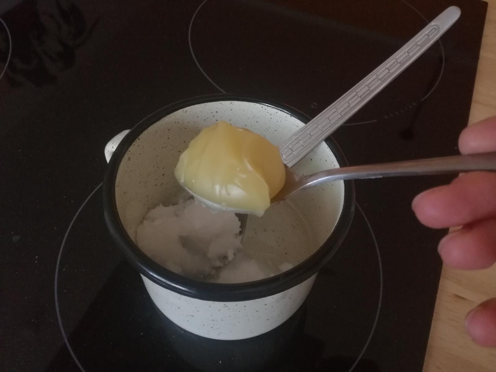 2. V nádobě si rozpustíme kokosový tuk (nebo sádlo). Dávám 2 lžíce, opravdu hooodně vrchovaté.