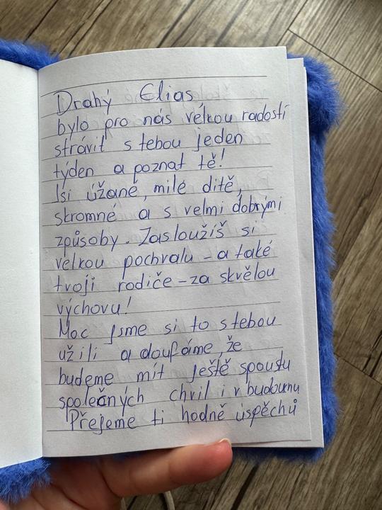 Ale ten nejcennější je bezesporu tento. Od maminky E. dostal památníček, kam mu napsala česky pár slov. Vůbec se nestydím přiznat, že u nich pokaždé brečím. Moc mě dojímá text i to, kolik práce ji muselo stát už jen to všechno přepsat. Eliho to neskutečně rozplakalo, poprvé si četl poslední noc v Řecku a od té doby ještě mnohokrát.