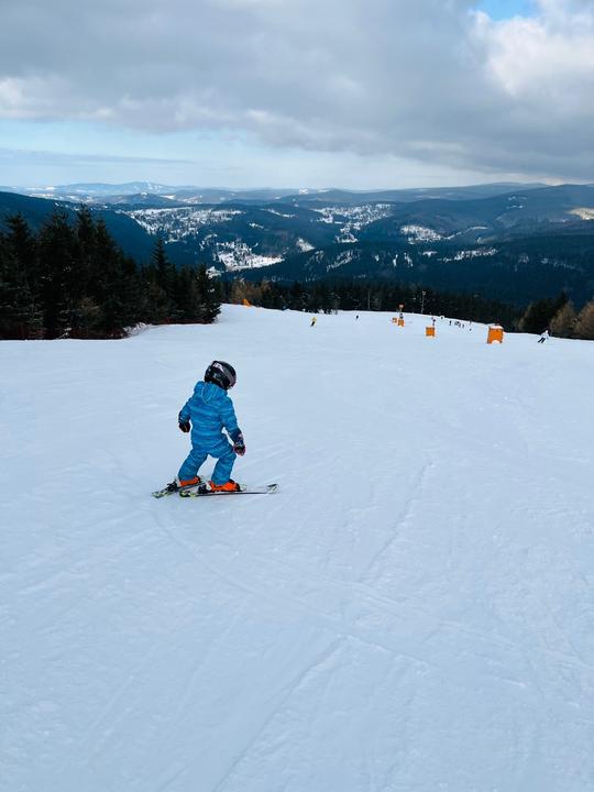 S Tobim lyžuje tatínek, ale tenhle týden mi úplně vytřel zrak, jaký už je to lyžař. Naprosto suverénně a radostně sjede červenou téměř dvoukilometrovou sjezdovku 👏