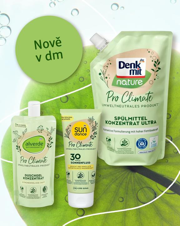 Jak to funguje? V dm vyvinuli jedinečný výrobní postup, který zanechává co nejmenší ekologickou stopu a kompenzuje nevyhnutelné dopady na životní prostředí v pěti oblastech: emise CO₂, eutrofizace, okyselování, oxidační smog a narušování ozonové vrstvy. ☀️ 🌊