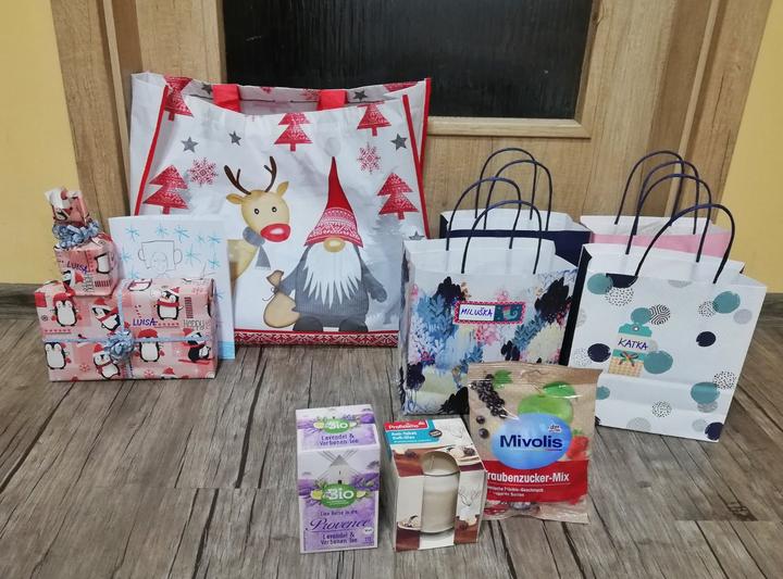 Pro paní uklízečky máme připravené další čaje a zabalené dárky jsou pro Eliho spolužačku, kterou si vylosoval jako kamaráda, kterému má dát na besídce dárek. A zabalený je ten krém s koalou, o který jsme nedávno soutěžili, a pak nějaké blbinky do vany na obarvení vody, praskaci kuličky,...