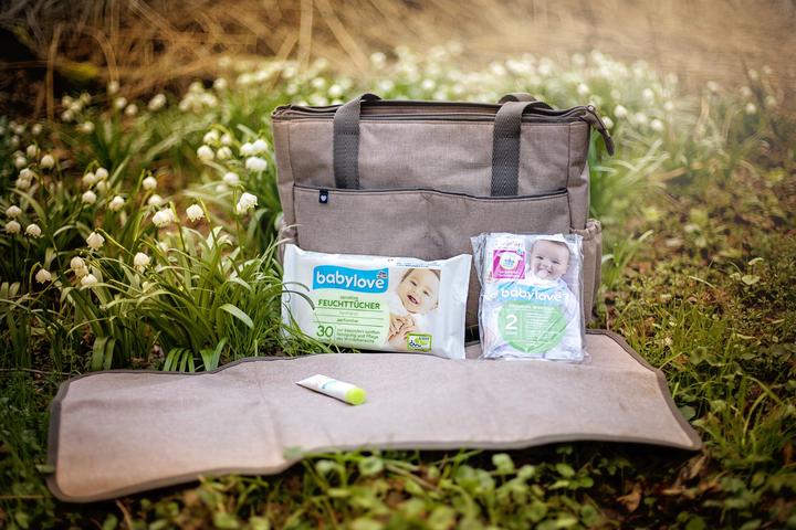 Součástí tašky je i přebalovací podložka, malé balení ubrousků, krém a 2 plínky.