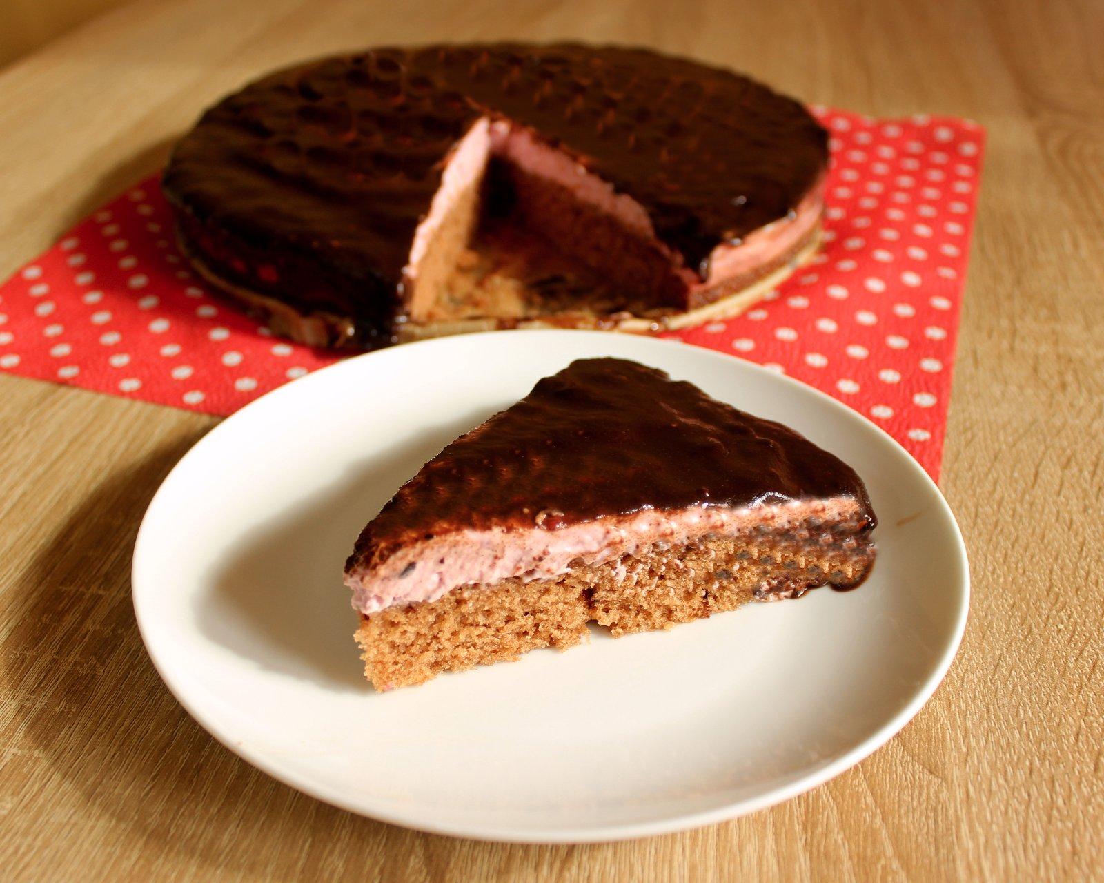 Poleva: 100 gramů čokolády rozehřát ve vodní lázni, v závěru přilít 100 ml smetany ke šlehání, promíchat a nalít na krém