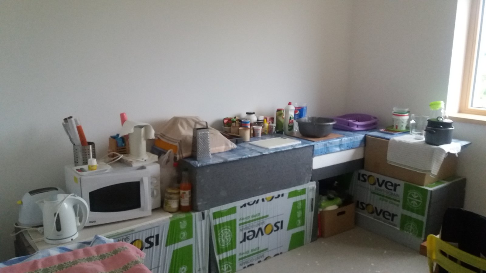 Já přidávám fotku kuchyně, kdy jsme neměli ještě naší vysněnou krásku vyrobenou. Na téhle polystyrenové kuchyni bylo super to, že se nemusela skoro uklízet. Žádné stopy od prstů na dvířkách, žádná zapečená trouba, žádné čistění dřezu 🙂 mělo to své výhody, ale i nevýhody. Teď už vaříme a pečeme s láskou v naší vysněné kuchyni, kde nejčastěji používám fialový hadřík od Viledy. Tablety do myčky, jar na nádobí jsou samozřejmostí.Čistič trouby a čistič na granitové dřezy od Eurony můžu doporučit, ale až dojdou, koupím právě zelenou řadu od DM. Fotka naší vysněné kuchyně mi nejde k této přiložit, tak přikládám v samostatném příspěvku. 🙃