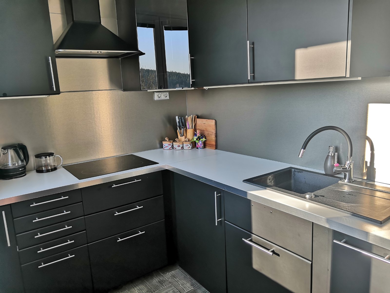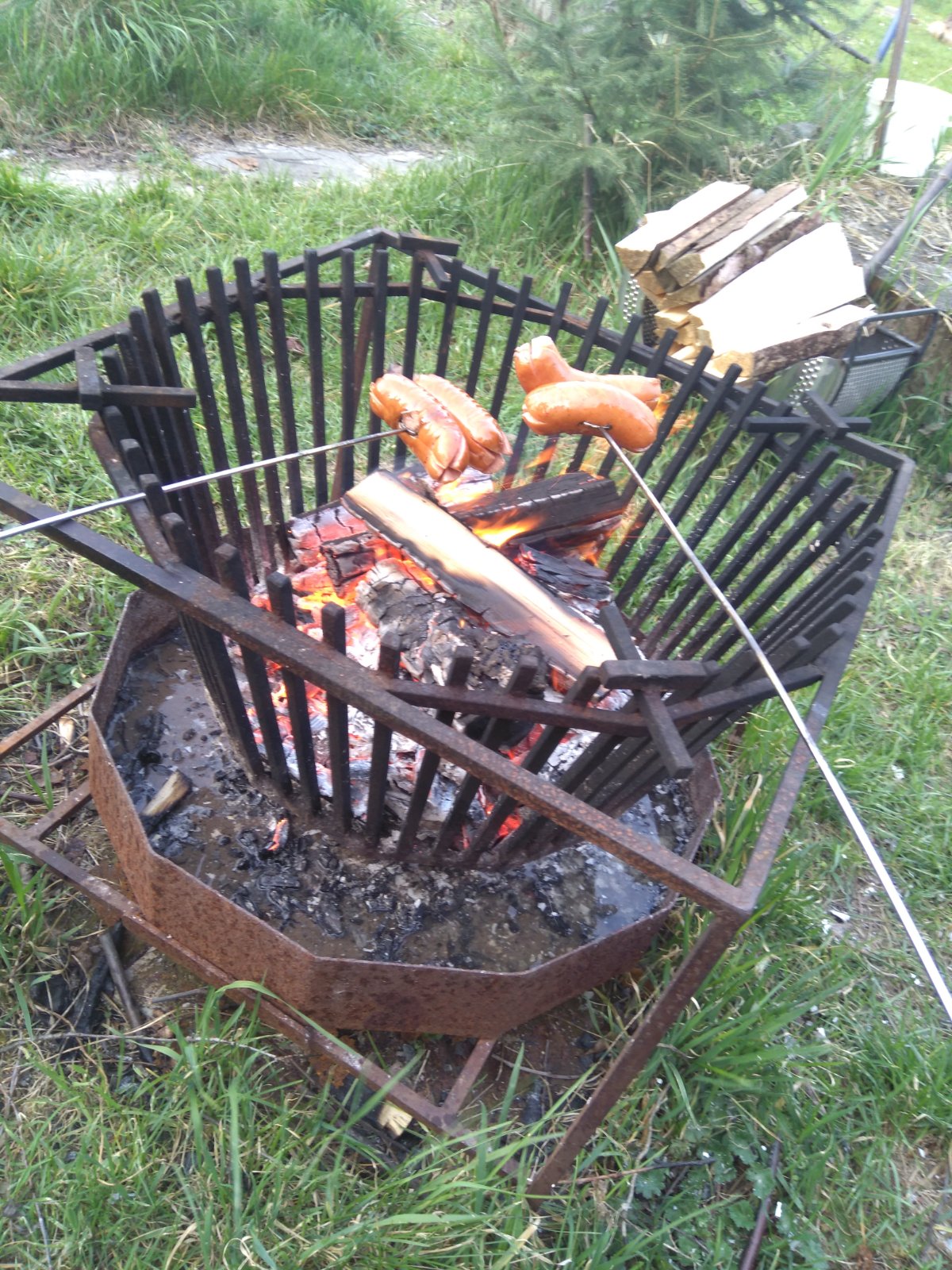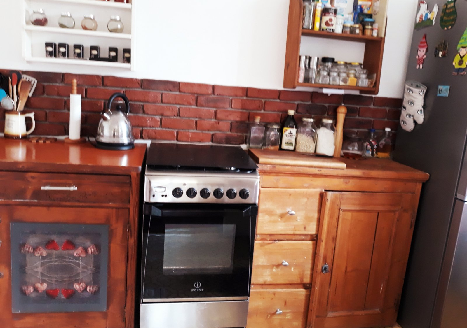 Tak toto je naše kuchyně. Velkou vychytávkou je držák polínek ze starého bubnu pračky, na ten jsme pyšní.