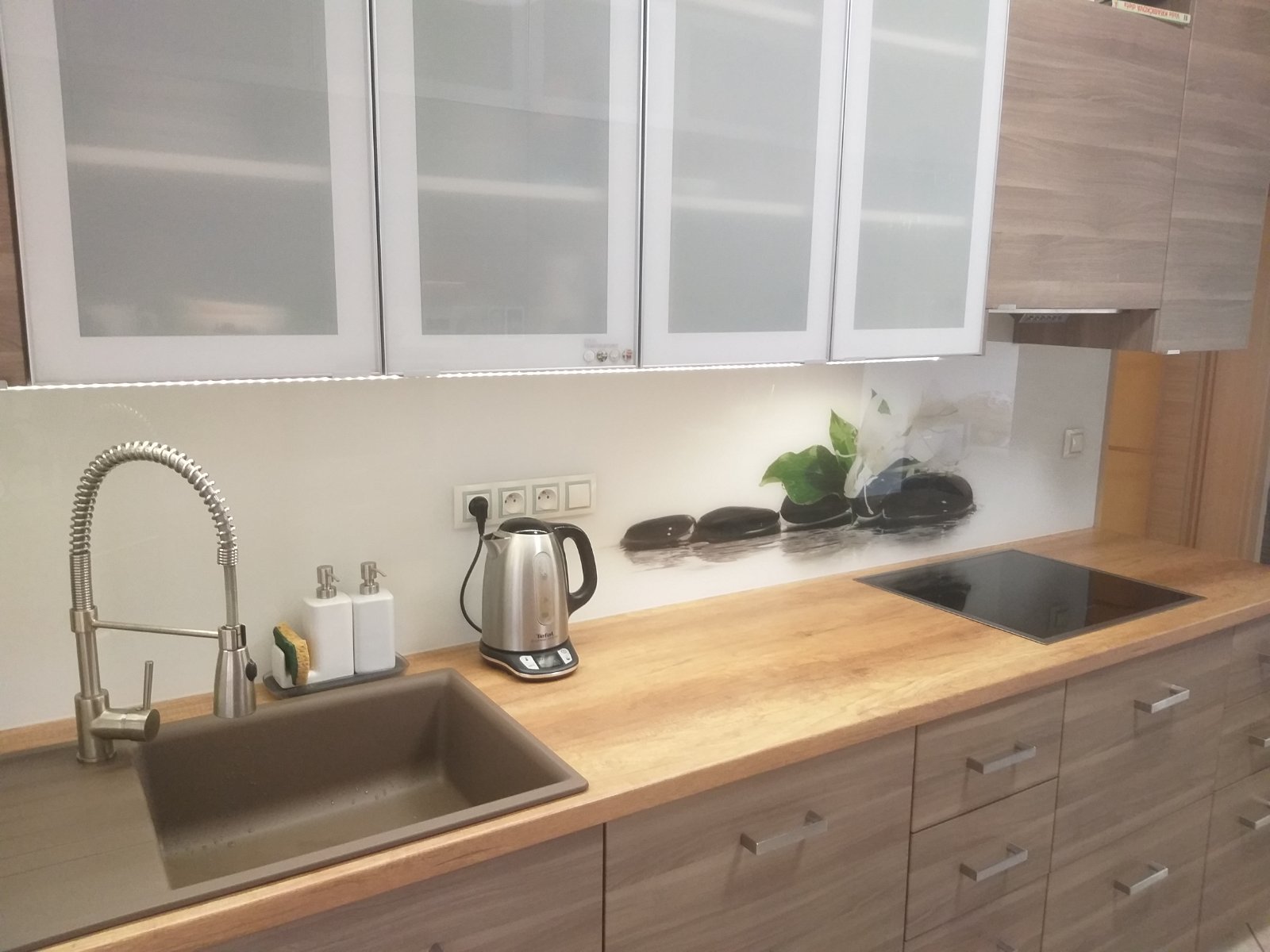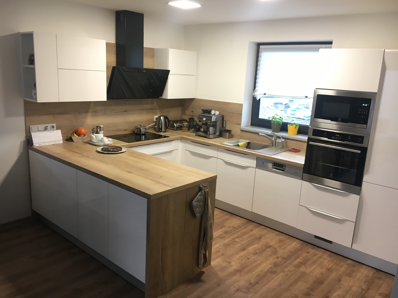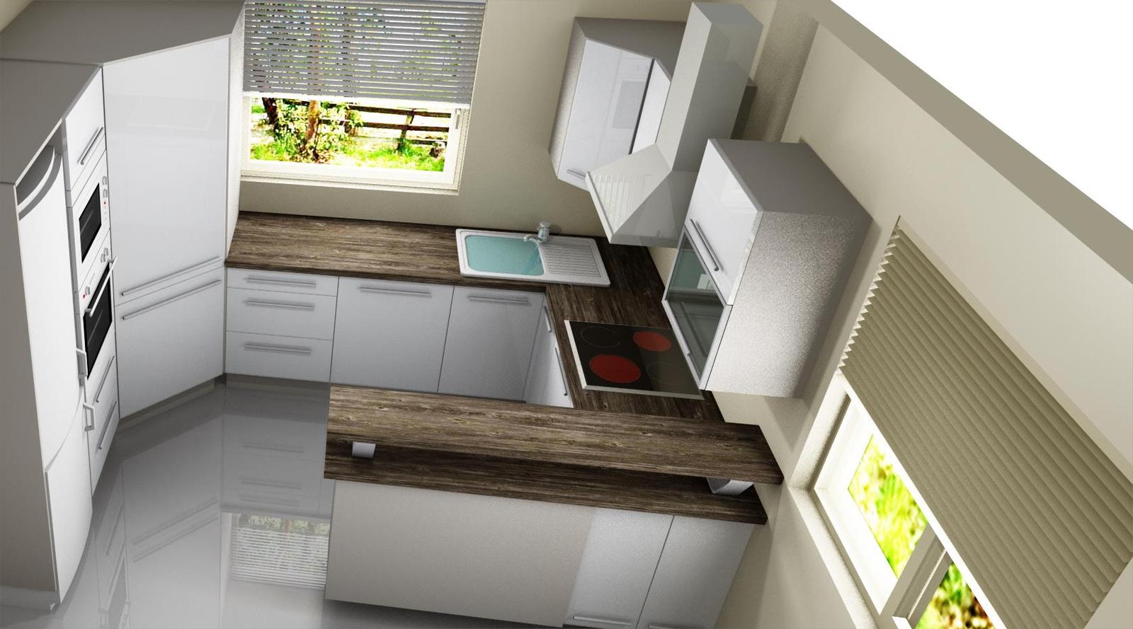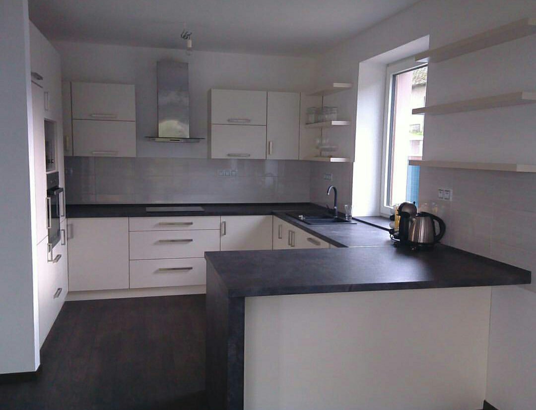 Nemohu dat svou kuchyn, protoze ten metrovy kus, na kterem ted varim neni reprezentovatelny a neni "muj". Ale na fotce je 1.navrh me budouci kuchyne v rozestautenem domku. Byl to jen nastrel a firma ted pracuje na upravach. Bude v bilem lesku, seda nebo tm.modra deska, vysouvaci digestor...