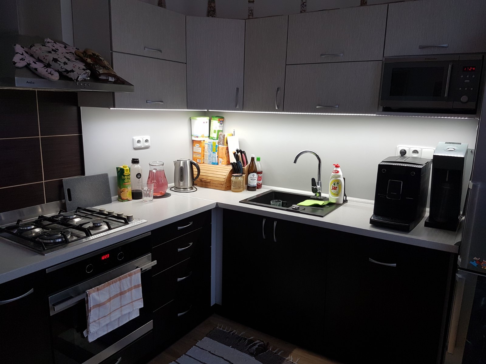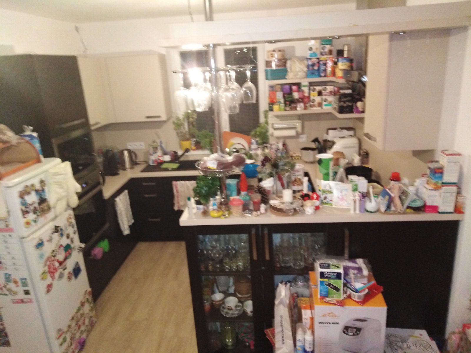 Přidávám část naší kuchyně, na fotce ještě chybí ostrůvek. Takhle uklizeno normálně nemám, ale zrovna jsme si nechávali dodělávat po pěti letech poslední řadu horních skříněk. Nejčastěji používám tablety do myčky (jar/dm), jar na nádobí (jar), otcovy čistič (dm) a přípravek na sklo (Clin).