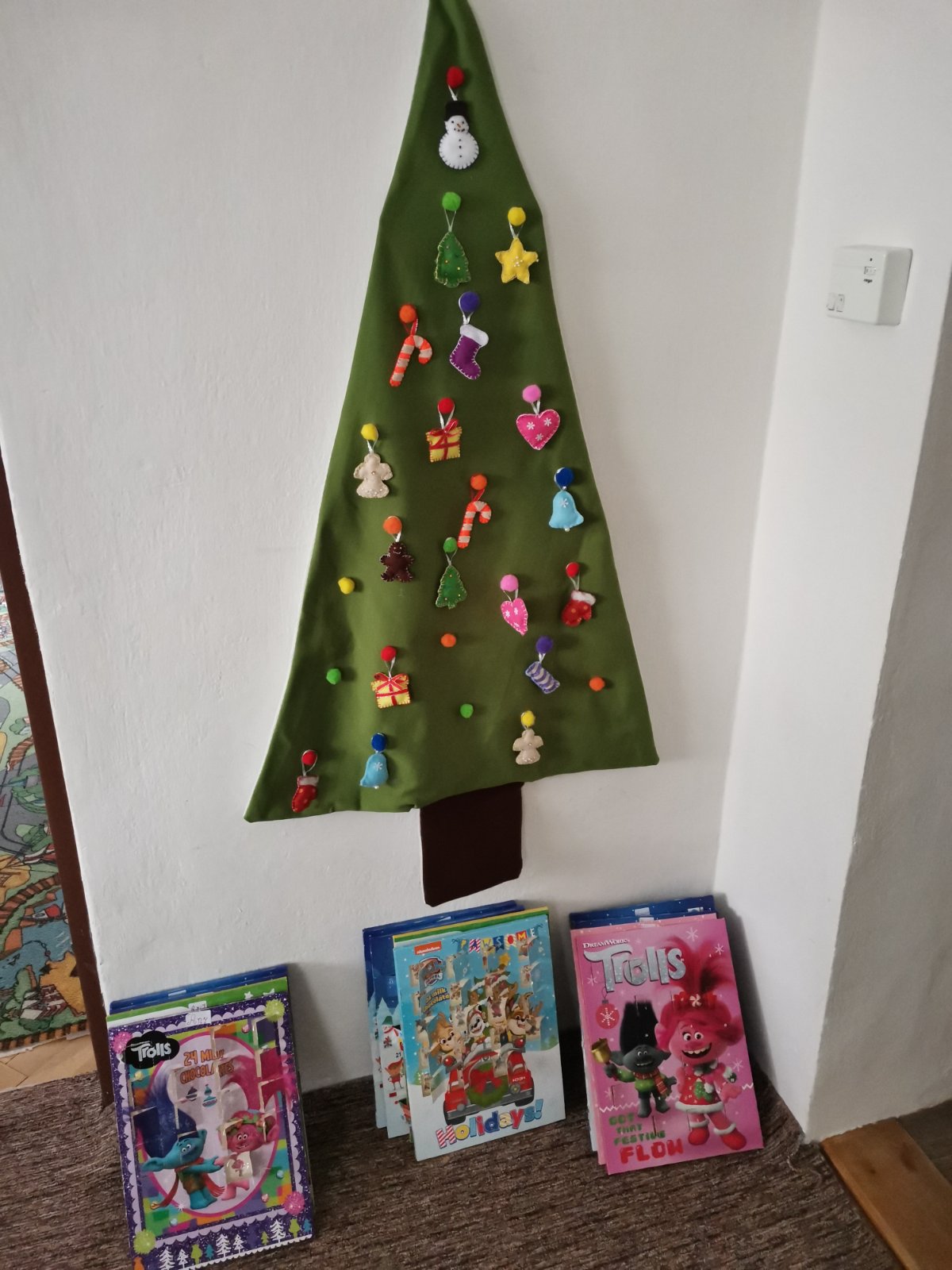 Mají dva, jeden vyráběny od babi, tam mají především sušené ovoce a oříšky a druhý ode mě, tam mají na každý den nějaké vyprávění, které souvisi a Vánoci, úkol a taky nějakou dobrutku jako sušene ovoce nebo oříšky, ovocnou kůži atp. Ale jsme tedy v otvírání hodně pozadu, vůbec letos nestíháme