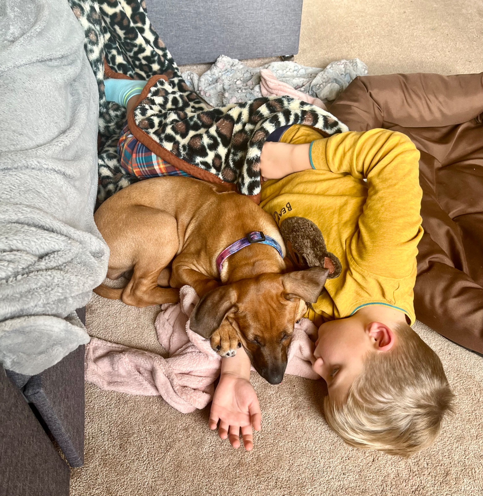 Ňuf...no muž pořád přemýšlí, že bychom měli psa (nejen kvůli dětem), ale já nikdy psy extra nemusela a do bytu se mi moc nechce a ještě ta práce kolem toho, uf, se třemi malými dětmi....ale když vidím tu fotku, haha. Ať se vám spolu hezky žije.