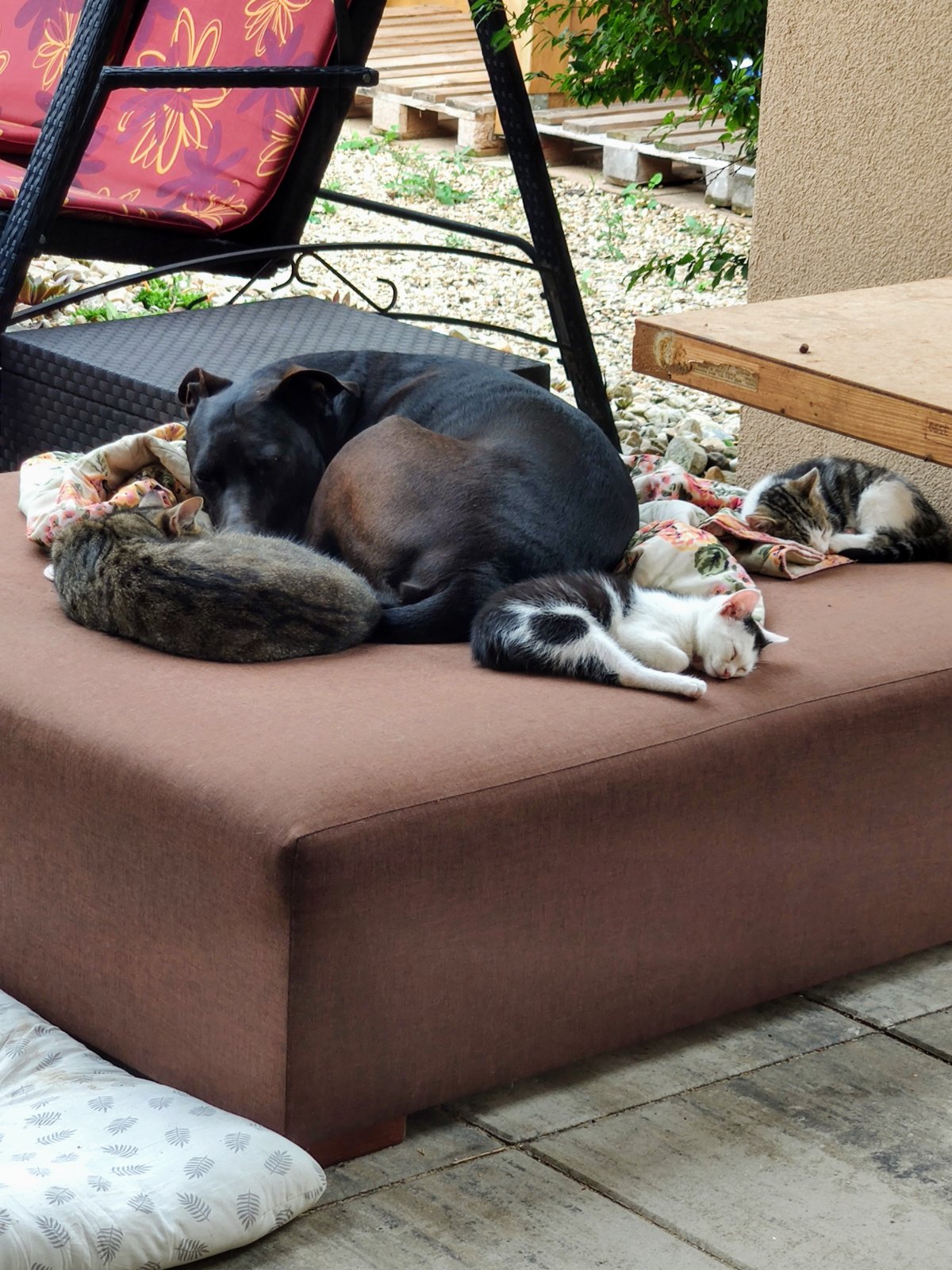 Radovaly by se 3 kočičky..roční Tim, 5 měsíční Miky a 5 měsíční Lucky. Tima a Mikyho jsme si vzali z útulku a Luckyho nám někdo hodil přes plot. Na fotce se svou adoptivní mámou - pitbulkou Shirou❤