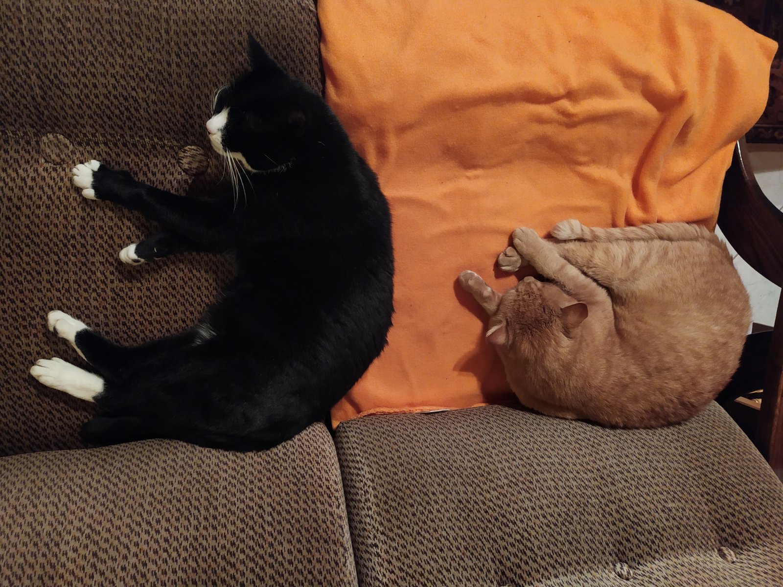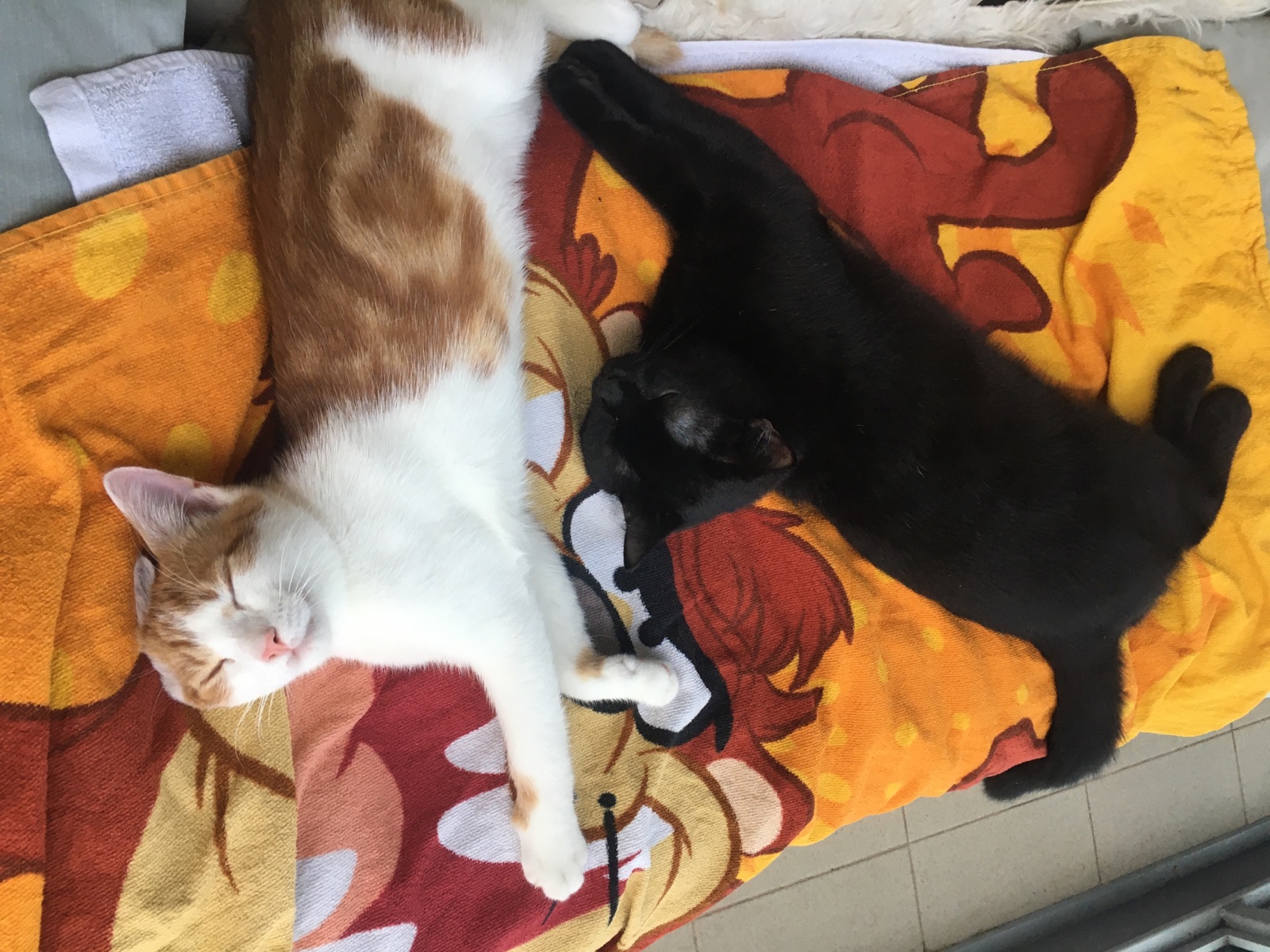 Mouris, Jonáš a Želvoun, tři kočičí nalezenci, tříletí, které nějaký hlupák vyhodil v papírové krabici u kontejneru v naší vesnici.. původně jsme je chtěli po vykrmení a vymazlení rozdat, nakonec si nás tři bráškové tak získali, že nám je bylo líto rozdělit a jsou u nás dodnes ❤