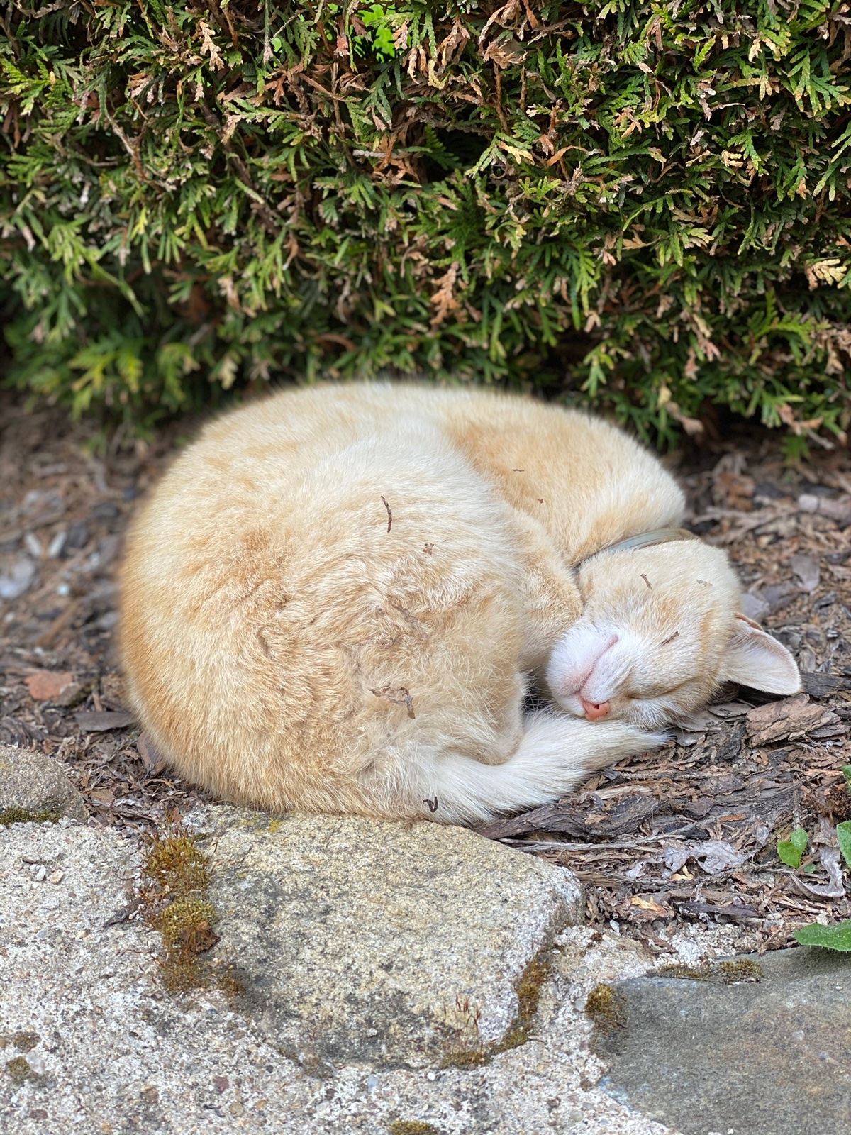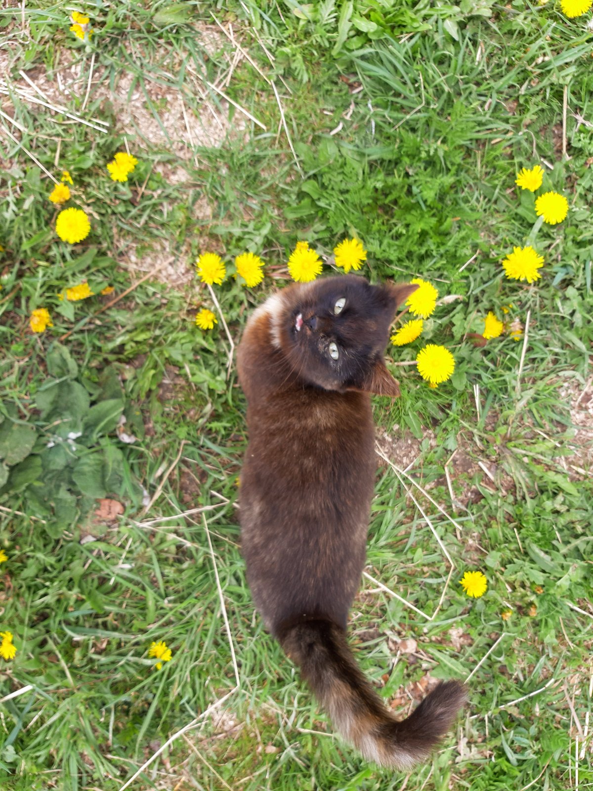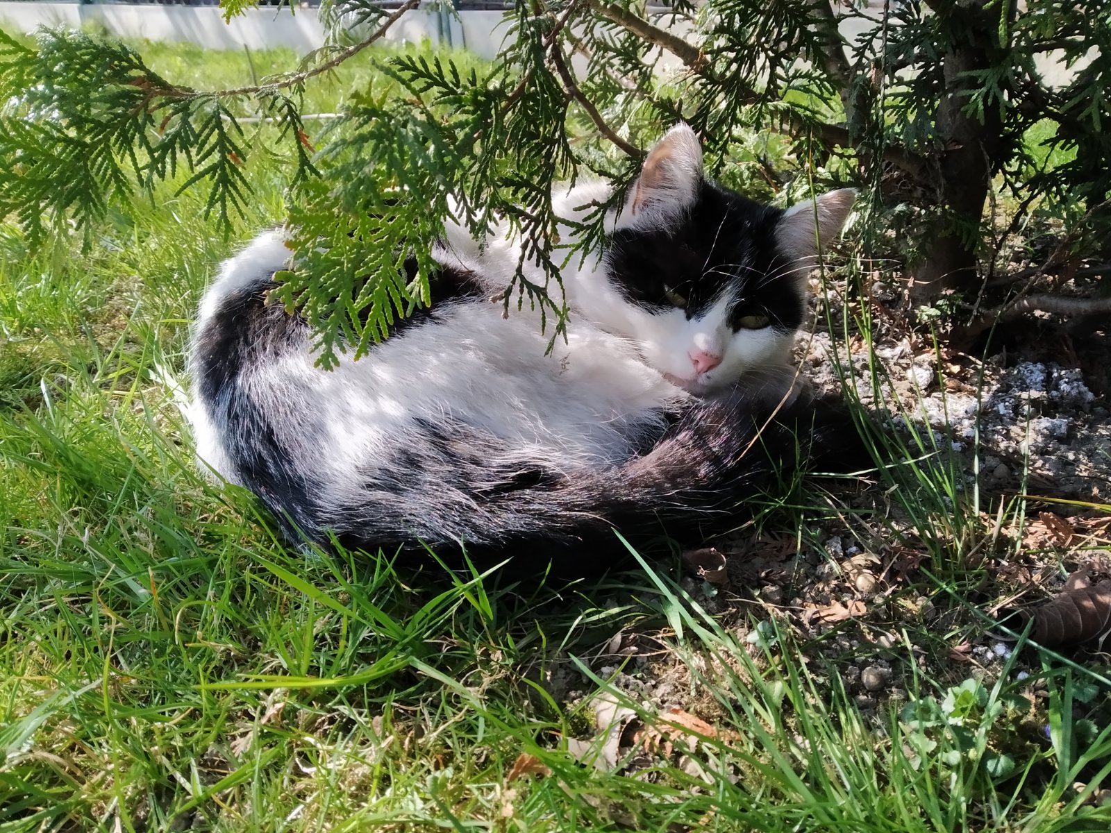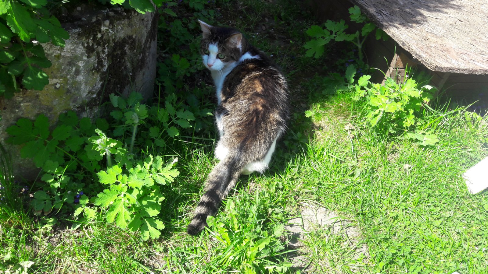 Kočka, kterou rádi krmime a drbeme, není naše. Buď je toulavá, nebo má hodně domovů 🙂 chybí ji jedna zadní noha, tak ji říkáme TROJNOŽKA. Popravdě to vypadá dost divně až strašidelně, tak ji asi dost lidi odhání...chodí si k nám pro pohlazeni a pak v naši společnosti odpočívá v trávě i hodiny