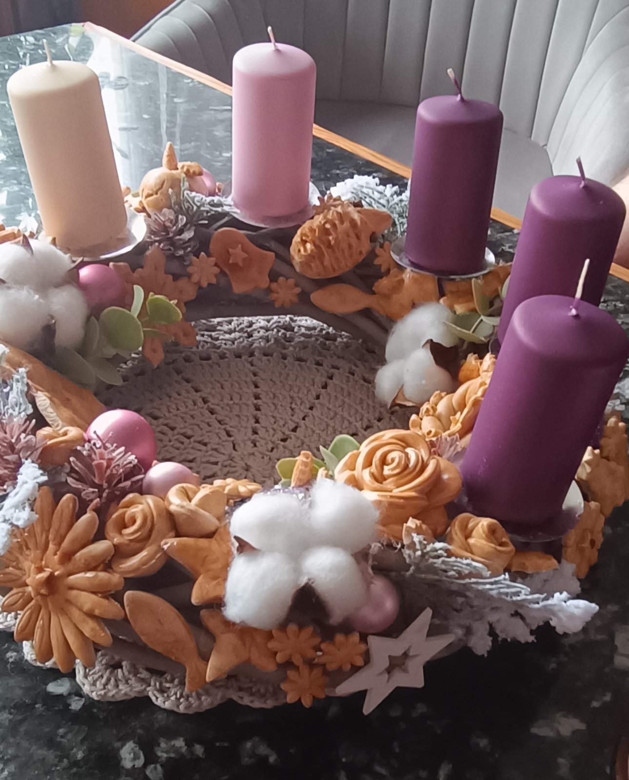 Mám věnec od kamarádky, zahradnice.Na stůl si vždy něco udělám sama.