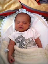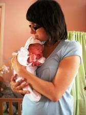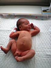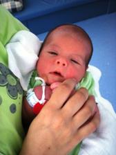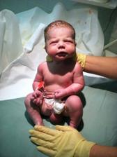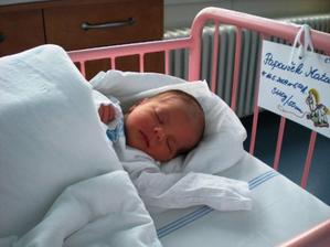 Do nemocnice jsem nastoupila 11. 5. kvůli podezření na preeklapsii. První dva dny se nic moc nedělo, akorát se mi v nemocnici velmi špatně spalo. 13. 5. mi lékaři oznámili, že se mi zhoršují výsledky krevních testů a že tedy přistoupíme k vyvolání porodu. Dopoledne mi udělali oxytocinový zátěžový test (ten dopadl dobře), potom jsem šla na prohlídku, kde mi lékařka udělala Hamiltonův hmat (ten teda docela bolel). V zápětí mě poslali ještě na poslední ultrazvuk před porodem. V té době přišel manžel na návštěvu, tak jsme jen absolvovali společně. Prcek měl váhový odhad 3 kg (plus mínus půl kila). Domluvili se s námi, že zítra ráno v sedm se přesuneme na porodní sál, tak až manžel přijede v osm. Potom jsem šla na pokoj a i s manželem jsme si krásně povídali a byli jsme oba natěšení na zítřek, až uvidíme našeho malého čumáčka. Manžel odjel domů a já přemýšlela, jestli si mám sbalit věci nebo jestli to nechám na ráno. Nakonec jsem odpočívala a povídala jsem si s holkama na pokoji. Večer už jsem měla pocit, že se asi něco začalo dít, tak jsem se šla zeptat sestřiček. Ty mě po vyšetření poslali zpátky na pokoj s tím, že jsou to pravděpodobně jen poslíčci a že mám jít do sprchy. Dala jsem si tedy dlouhou sprchu, ale nijak moc to nepomáhalo, bylo mi špatně. Nakonec jsem se dobelhala do postele a snažila jsem se usnout. Ty bolesti ale nešlo zaspat, tak jsem je začala stopovat na mobilu, byli vždycky 5 minut. Vydržela jsem to asi hodinu a pak jsem zase šla otravovat sestřičky (asi kolem jedenácté večer). Znovu mi odpověděli, že to nic nebude, ale raději mě vyšetřili. Chtěli mě poslat zpět na pokoj, ale já jsem se bránila, že jestli tohle není ono, tak už fakt nevím, co mám jako čekat. Bolesti byly čím dál tím horší. Udělali mi tedy monitor a na něm se kontrakce naštěstí potvrdily. Musela jsem počkat na lékařku a na vyšetřovně jsem tedy hledala nějakou polohu, jak si ulevit. Nakonec jsem skončila opřená o opěry nohou na vyšetřovně. Musel na mě být fakt dobrej pohled. Když přišla doktorka, vyšetřila mě a řekla, že budeme rodit, ale že jsme na samém začátku. Měla jsem se tedy sbalit a i se všemi věcmi přesunout na porodní sál. Volala jsem manželovi aby přijel. Za to, že jsem si balení nechala na nejméně vhodnou chvíli jsem se proklínala, protože balit mezi kontrakcemi bylo hrozně vysilující a obtěžující. Úplně mě to vyděsilo, říkala jsem si, jak to celé přežiju, když tohle je teprve začátek. Sestřička mi pomohla s taškou a výtahem jsme sjeli na patro, kde jsou porodní sály. Šla jsem na nadstandardní pokoj. Byla jedna hodina v noci. Kontrakce byly jedna od druhé horší a horší. Ptala jsem se porodní asistentky, zda bych mohla dostat epidural. Byla starší a měla jsem z ní pocit, že si mě automaticky zařadila mezi sraby, když hned po vstupu na porodní sál chci něco od bolesti. Asi za deset minut přijel manžel. Bylo na něm poznat, jak je rozespalý. Následovalo vyšetření od lékařky, bylo nám sděleno, že je to pořád na začátku, že se moc neotvírám (zatím 2 cm). Znovu jsem požádala o epidurál (tentokrát doktorku, protože porodní asistentka na moji žádost moc nereagovala – a slyšet ji určitě musela). Chvilku na to přišla anestezioložka a epidural mi zavedla. Pak následovaly dvě naprosto klidné hodinky, kdy jsem jen ležela na lůžku a odpočívala. Hrozně mi to pomohlo, byla jsem nevyspaná a unavená a díky tomu jsem nabrala síly. Nemohla jsem si nijak ulevit, protože jsem byla napojená na monitor a musela jsem tedy zůstat na posteli (všechny plány na sprchu a míč byly rázem ty tam). Poslouchali jsme s manželem hudbu, povídali si, každou půl hodinu nás přišla vyšetřit doktorka (vzhledem k tomu, jak jsme byli rizikový, nás pak už sledovala jen lékařka). Po čtvrté hodině nám doktorka řekla, že by chtěla malého sledovat trochu lépe a že mi zavedou sondu na hlavičku miminka a budou jeho tep monitorovat přesněji. Musela tedy přistoupit k protrhnutí plodových obalů a odtoku plodové vody. Poté už byly kontrakce zase silnější a musela jsem je prodýchávat. Při posledním vyšetření kolem páté jsme byli na 4 cm. V půl šesté za námi přišla doktorka, která mě sledovala celé těhotenství, a ta mě vyšetřila a ptala se té druhé lékařky, jak jsme na tom byli před chvílí, že teď už jsme prý na 8 cm. Po dalším vyšetření v 6 hodin nám bylo nakonec řečeno, že už jsem otevřená, ale že malej nezrotoval správně hlavičkou a že by bylo lepší přistoupit k císařskému řezu. No, upřímně – nadšená jsem z toho zrovna nebyla, ale nedalo se nic dělat. Najednou to šlo hrozně rychle: zastavili mi kontrakce, vycévkovali mě, naložili na vozík, převezli na sál, přelezla jsem si na stůl, do kanyly na zádech mi dali další dávku epiduralu a už se jelo. Přivedli tam manžela v tom lékařským mundúru, koukal na mě přes roušku. Přišlo mi to roztomilé, ale do smíchu mi zrovna dvakrát nebylo. Myslela jsem na našeho broučka a že už ho konečně za chvilku uvidím. Přivezli tam inkubátor, to mě trochu vyděsilo (byla jsem 36 + 4 tt), ale snažila jsem se myslet pozitivně. Manžel mě celou dobu držel za ruku a koukal se do operační rány, občas něco prohodil. Sama jsem si vůbec nepřipadala jako že mě zrovna operují, ale cítila jsem co zrovna dělají. Když malého vytáhli, utíkali malého ošetřit, manžel šel hned s nimi. Hned byl slyšet křik – ten nejkrásnější na světě. A já už byla konečně klidná. Manžel se vrátil samozřejmě se slzami v očích. Malého mi přinesli ukázat. Byl nádherný. Odnesli ho na novorozenecké a mě mezitím zašili. Ještě na sále se mi udělalo špatně, měla