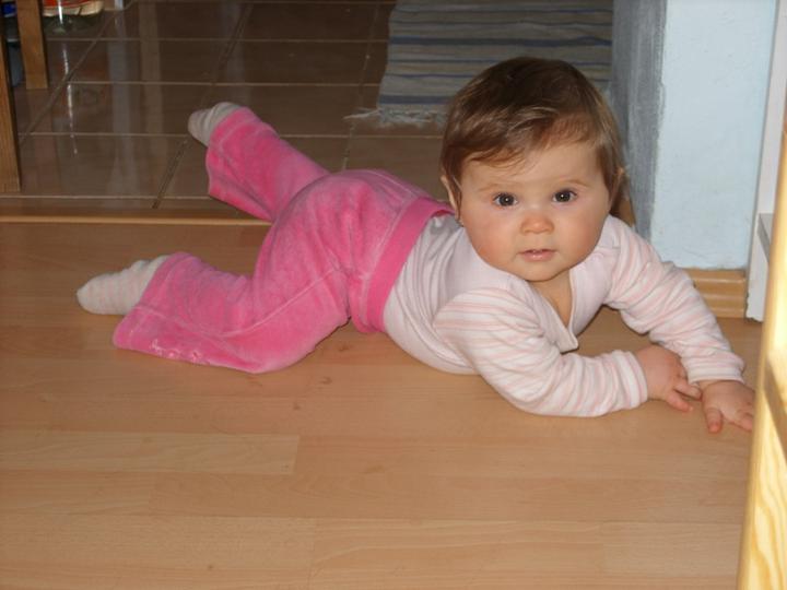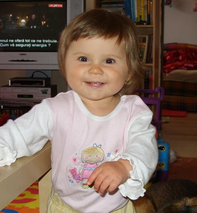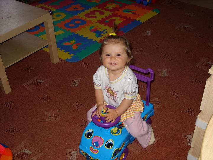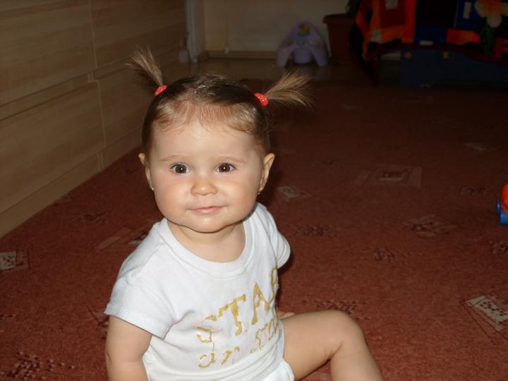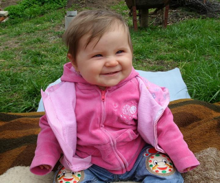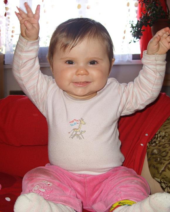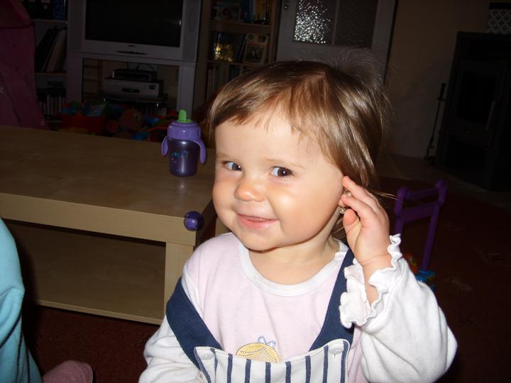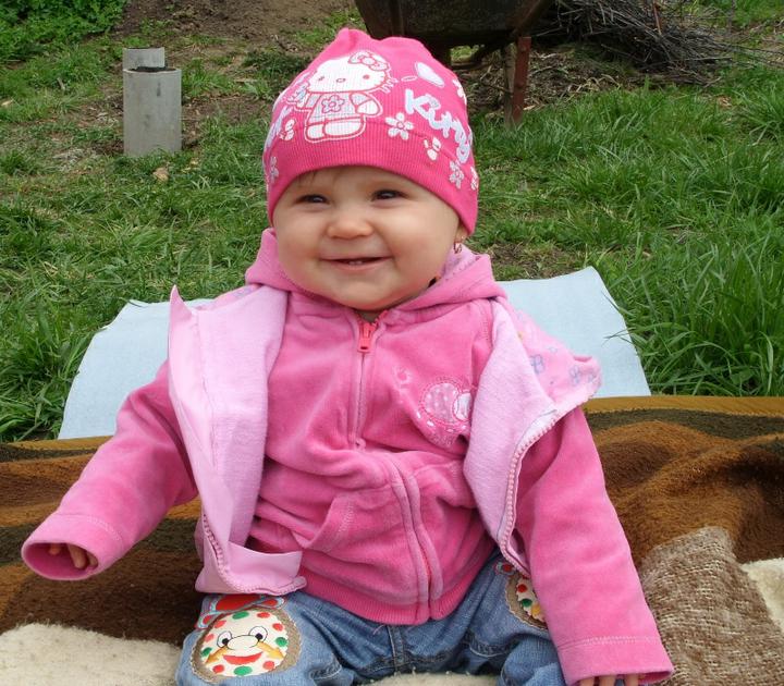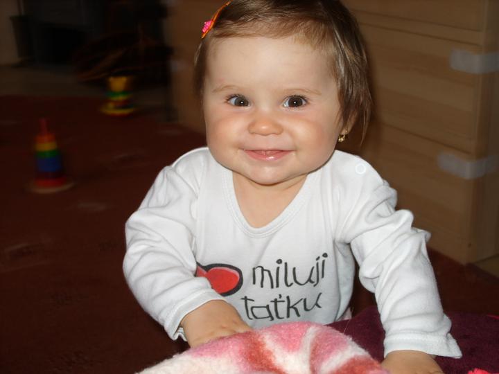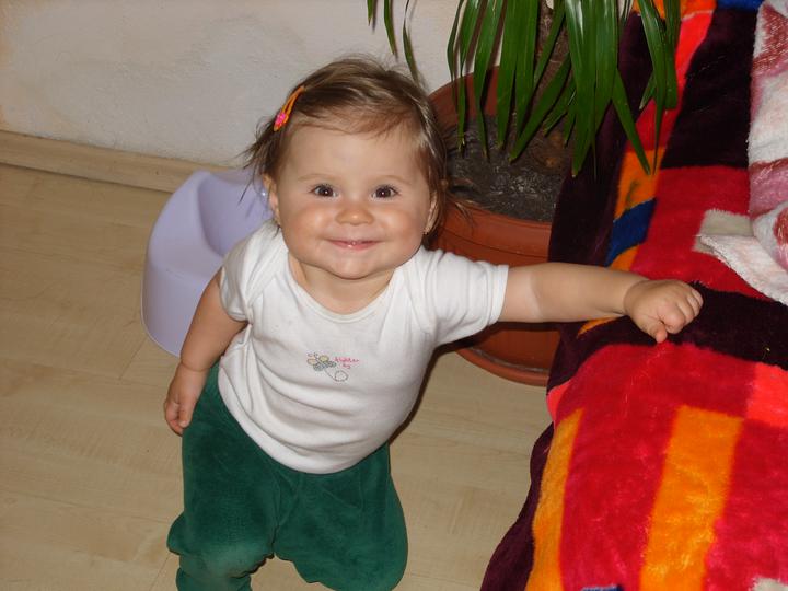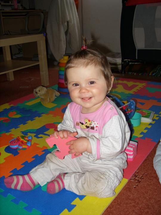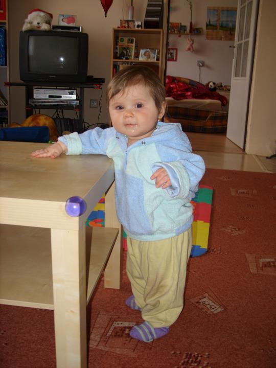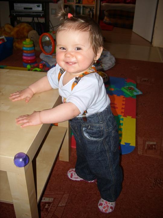 Emi už má 14 měsíců, krásně chodí sama i venku terén docela zvládá, poslední dobou stále opakuje baf, baf, mama, tata, ham a má už 8 zoubků. Umí ukázat pupík, ouško a nosík a je to okatá divoška plná energie