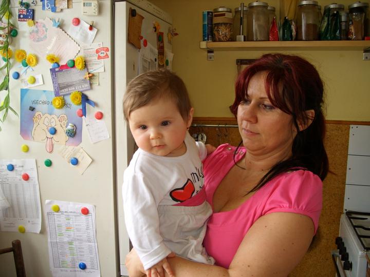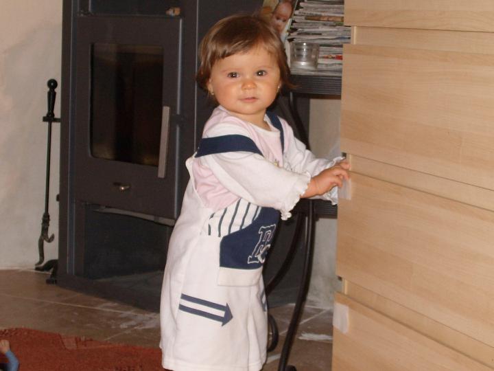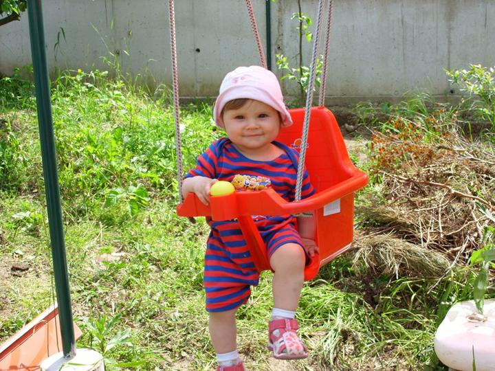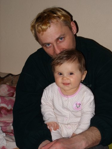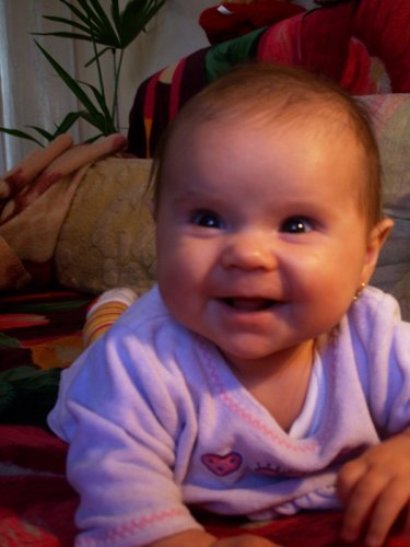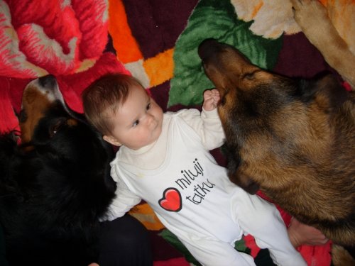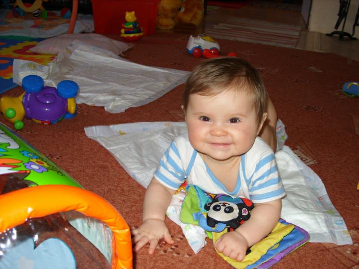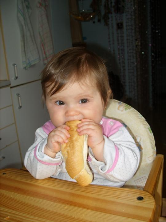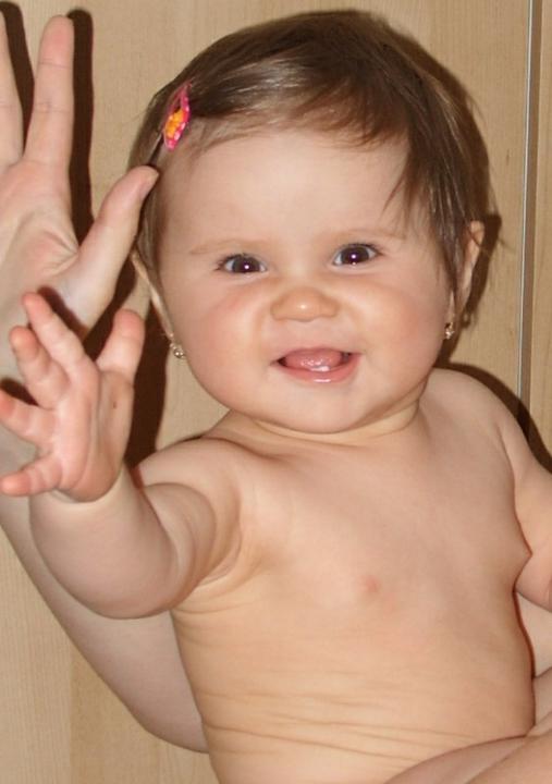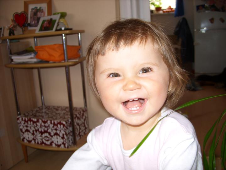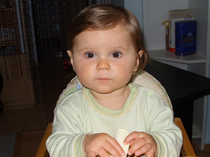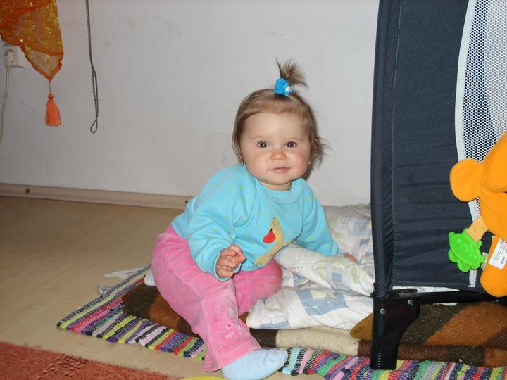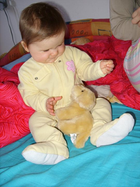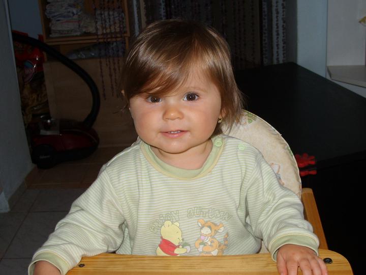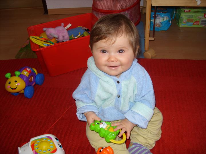 Emi už má 14 měsíců, krásně chodí sama i venku terén docela zvládá, poslední dobou stále opakuje baf, baf, mama, tata, ham a má už 8 zoubků. Umí ukázat pupík, ouško a nosík a je to okatá divoška plná energie