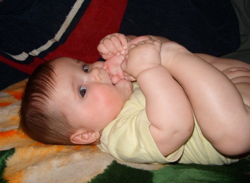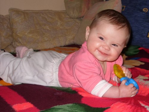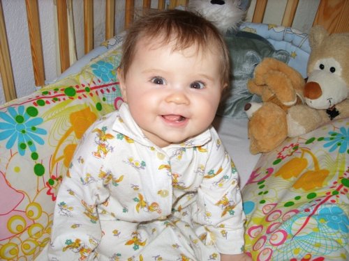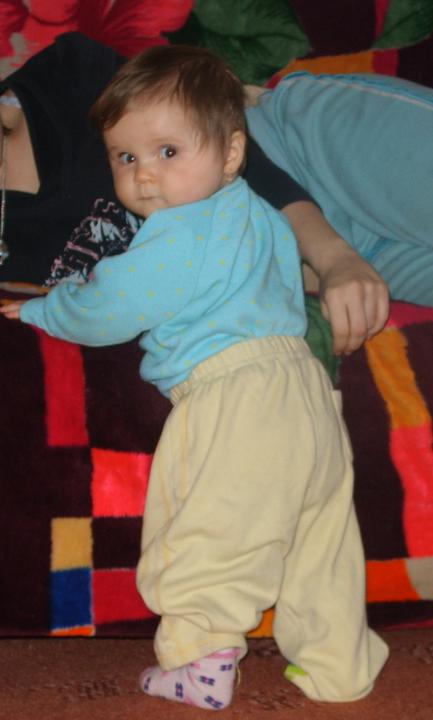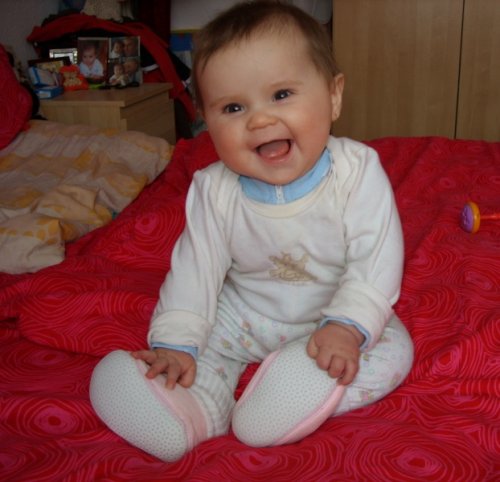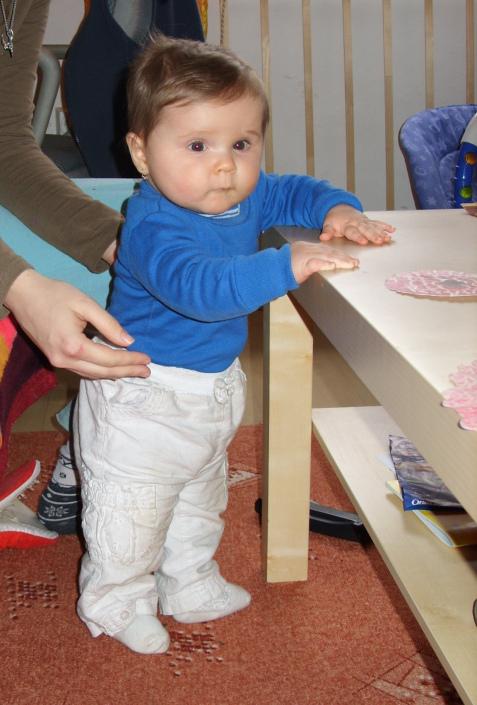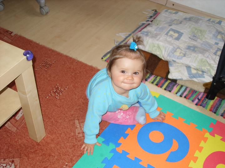 Klube se nám 6. zub, 2. pravý dole a naše šikula už umí sama vylézt na velkou postel a pohovku - jen dolů nám to moc nejde. Taky krásně chodíme přidržením za jeden prst a doma zkoušíme pár krůčků samostatně.