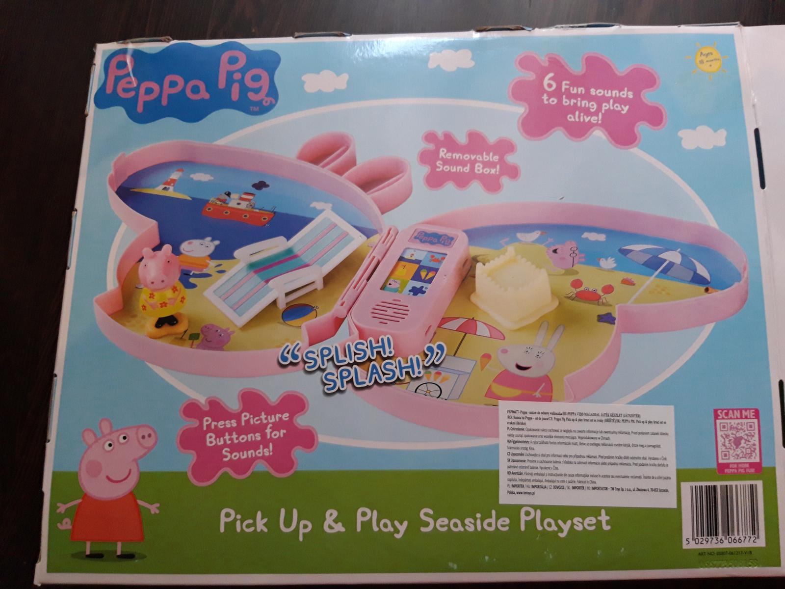 Uvnitř krabičky je nakreslený obrázek pláže a moře. Součástí je figurka prasátka, plastové lehátko a hrad z písku. Peppa je asi v plavkách. Nemá červené šaty, jak mě syn upozornil. Dále je součástí také ovládání vydávající 6 různých zvuků. Baterky byly součástí balení, což je fajn. Všichni známe zklamání v dětských očích, pokud dítě dostane dárek na baterky a žádné doma nemáme. Zvuky jsou spíše pro menší děti. Našeho tříapůlletého chlapečka už tak nezaujaly. Kolem roku, roku a půl věku by to bylo jiné. V tu dobu ho zajímala každá hračka vydávající zvuky.