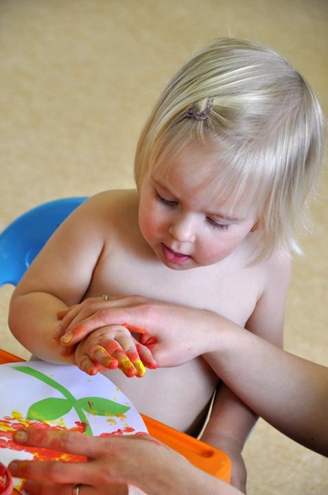 Přistoupíme ke hlazení končetin. S dítětem si stále povídáme. Komentujeme a pojmenováváme jednotlivé části těla, dokonce označujeme pravou a levou stranu. Při hlazení prstíků prohněteme jeden za druhým. Upozorníme dítě na dlaň. Promasírujeme celou paži. Po trpělivém a citlivém zvednutí paže jemně pohladíme prostor pod paží.