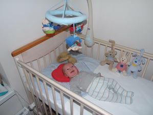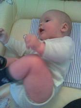 Je mi 6 tejdnů a vážím 4940g, myslím, že 700g nahoře za 14 dní je taky slušnej výkon 😉. Kyčle mám v pořádku, už asi 2 tejdny se směju na kohokoli, kdo si se mnou hezky povídá (hlavně teda na maminku a tatínka, samozřejmě! 😉)), sleduju kolotoč a všechny hračky, který kolem mně mamka věší, pasu o sto péro, i když se ještě trochu kymácím 🙂)...a halvně všem dělám jenom radost, no ještě aby ne! 🙂