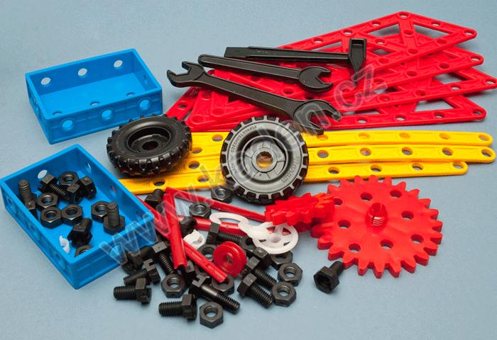 Další polytechnická stavebnice s dlouholetou výrobou v ČR. Dílky jsou z trošku ohebného plastu a spojují se klasicky se šroubkem a matičkou. Syna na tom nejvíc baví nářadí (kladivo, klíče) a pak uzubená kolečka s řetězem a kličkou, takže se s nimi dá po sestavení točit.