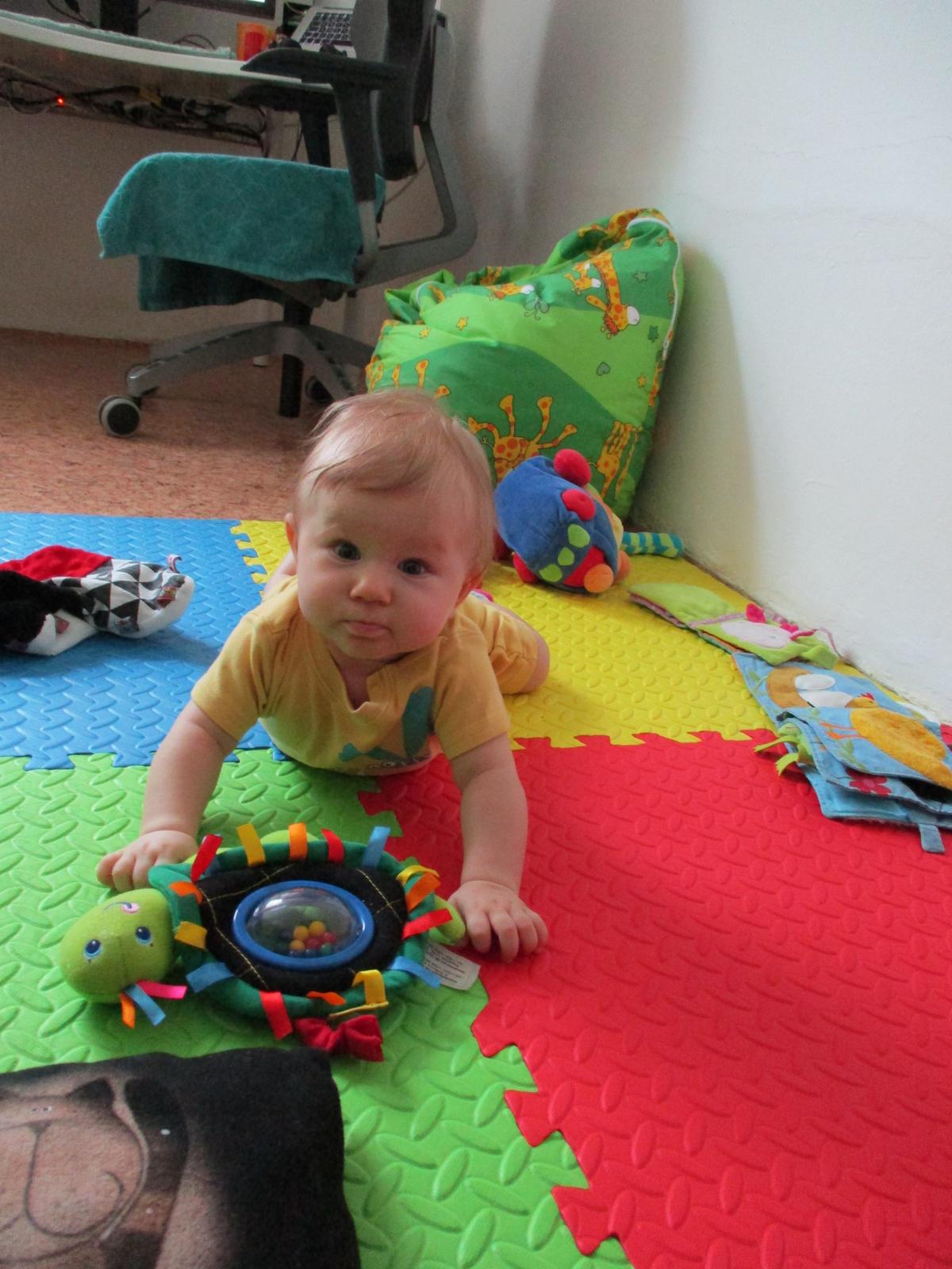 Reflux, nereflux, Světlanka už je na břiše ve svém živlu, točí se kolem své osy a už i trošičku zkouší dávat kolínka pod sebe. Takže všem, kteří taky bojují se zpožděním v pasení koníků kvůli refluxu bych vzkázala, že nic není ztraceno a mimčo to pomalu ale jistě začne vše dohánět!