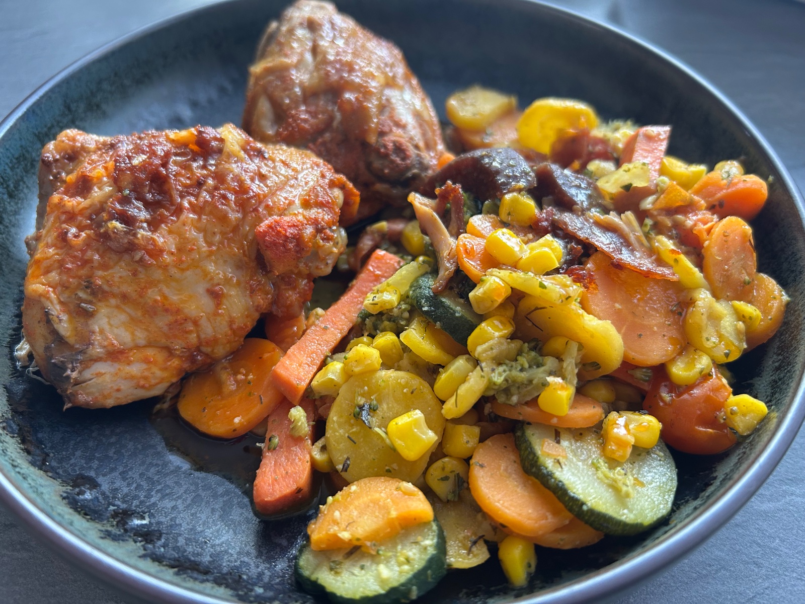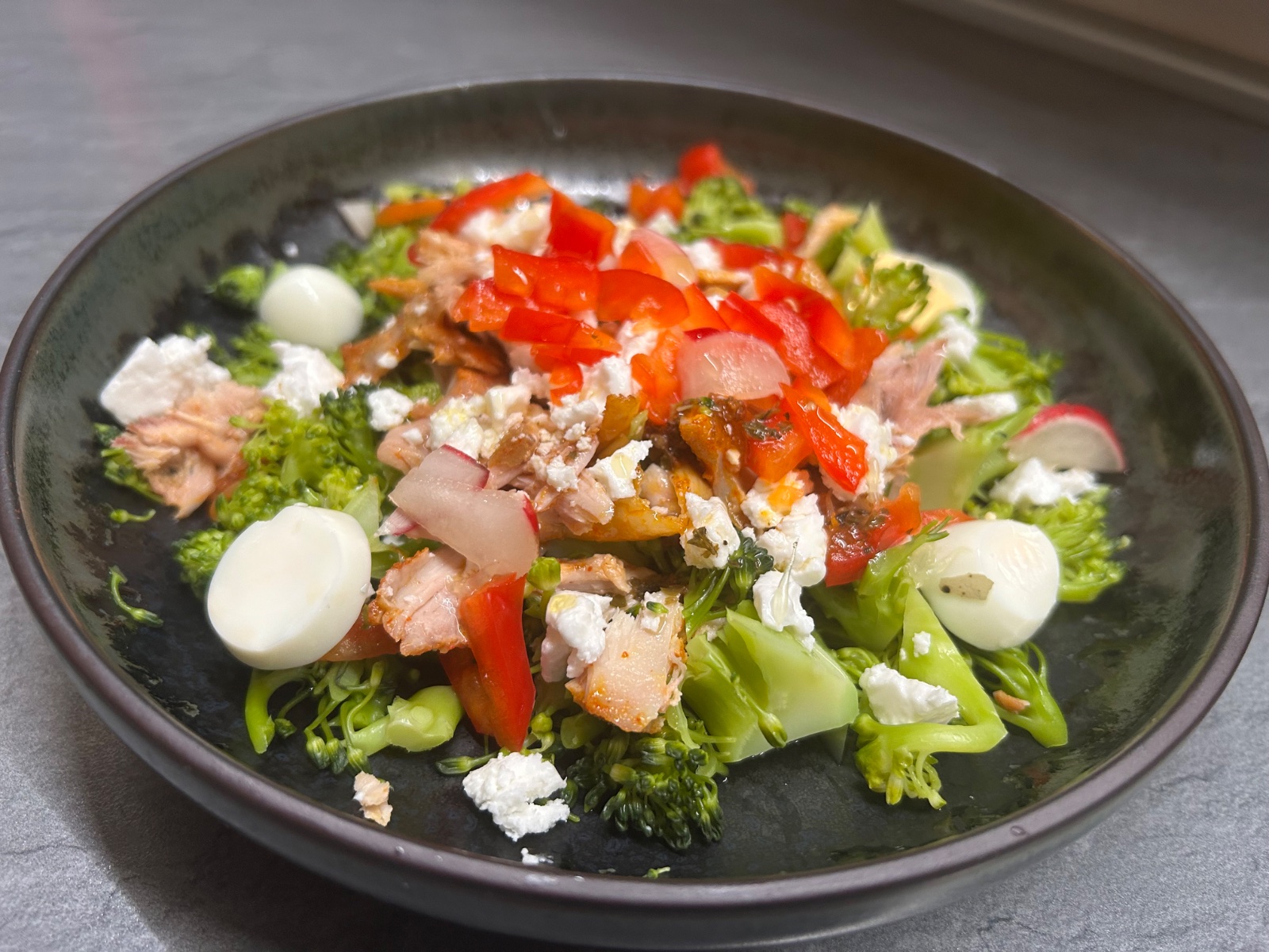 - dnes horní kuřecí stehna s dušenou zeleninou na oběd a večer stehno s brokolicí, paprikou, kozím sýrem a křepelčím vejcem