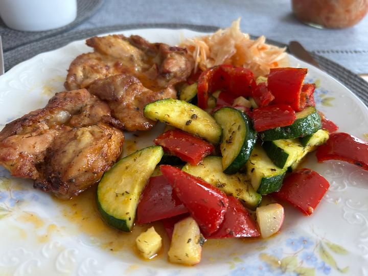 - proběhla několikrát dušená zelenina s / bez červené řepy a cuketou - jako salát nebo s vepřovou panenkou či s kuřecími stehny