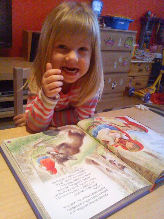 dneska jsme v obchodě kupovali outdoorovou bundičku pro Karamelku měli červenou a modrou. Ptám se :Karamelko jakou si vezmeš červenou jako maminka nebo modrou jako tatínek? Modlou mamí modlou, A proč Modrou?Plotože v červené mě sní vlk😀