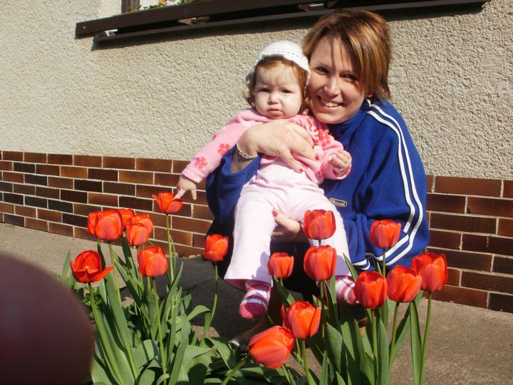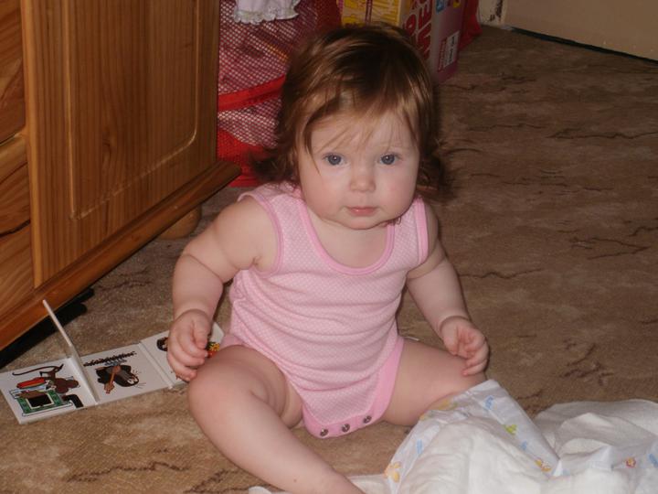 Duben 2010 - Anička už drandí po bytě a leze jako "motorová myš".....všechno jí moc zajímá. Zkouší se už stavět na nožičky,zatím je velmi opatrná. Jinak máme za sebou rotavirovou infekci, 8 zubů a teď jsme chytili pěknou rýmu.