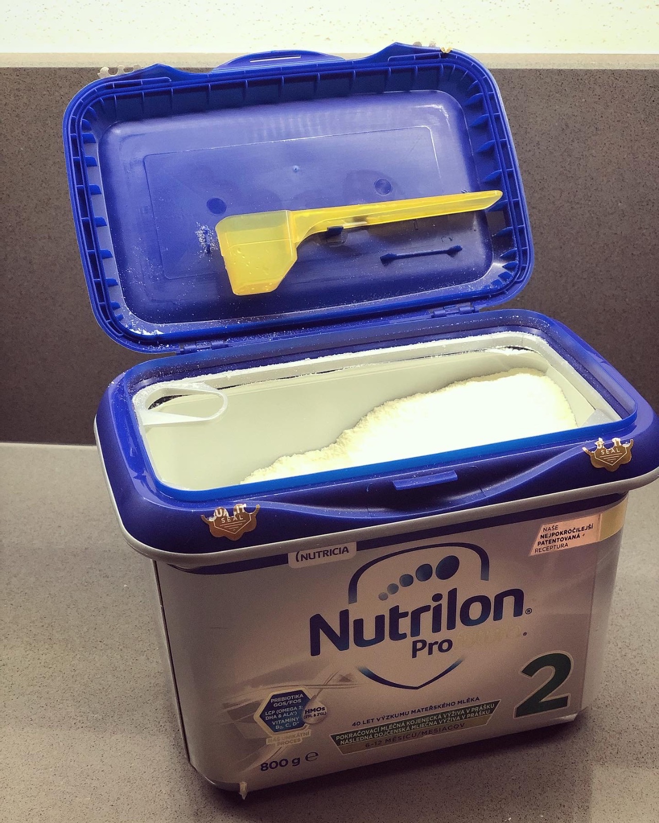 Šarlot je kojené miminko, nikdy umělé mléko neměla, ani jsem ho nekupovala pro „kdyby náhodou nešlo kojení“, říkala jsem si, že tohle si nebudu vůbec dávat prostě do hlavy. Takže když jsem potřebovala někdy odejít, baštila odstříkané mléko z lahvičky. Plán byl začít s příkrmy po ukončeném šestém měsíci. Protože ji ale bude jednou asi jednodušší šatit než živit, udělala mi trochu čáru přes rozpočet a před Vánoci, v pěti měsících, vyžadovala tvrdě ochutnat něco jiného než „prostě pořád to mlíko“! A tak jsme se celkem rychle dostali k dnešnímu stavu, kdy mléko pije jen večer a nad ránem, jinak baští „jako normální člověk“. S pitím je to trochu horší, protože než jsme našli čaj, který jí vyhovuje, celkem to trvalo (takže dětské čaje budu dopíjet ještě další zimu). Proto jsem také chtěla zkusit Nutrilon Profutura 2 – jako pití po jídle během dne, a také do budoucna na případy, kdy budu muset nebo chtít odejít, tedy až odejde koronavirus, protože kam bych teď taky chodila🙂, zachraňujeme svět sezením na zadku🙂