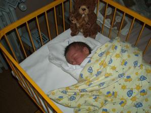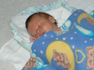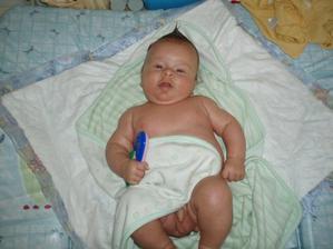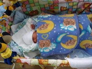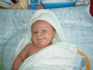 Prcek měl vedle hlavičky i ručičku, takže byl nutný nástřih, ten jsem zaznamenala, ale nebylo to nic hrozného... A pak ještě dvě tři zatlačení a Pepínek byl venku /19.05h/, prcek měl 3,61kg a 47 cm...