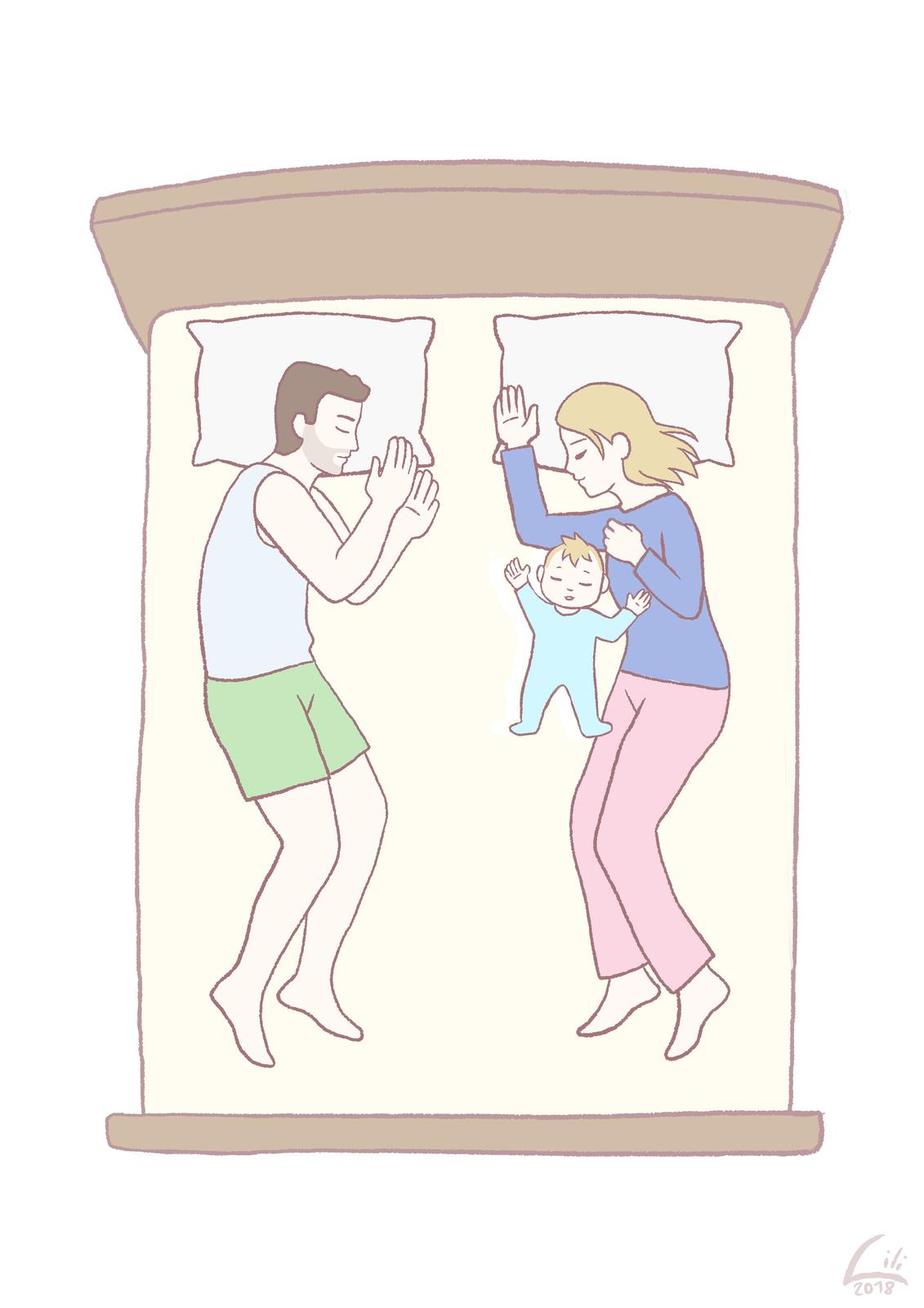 Pokud se s kontaktním rodičovstvím zatím jen oťukáváte, možná jste se už setkali s vtipnými obrázky, které zobrazují společné spaní s dětmi. Většina jich vypadá nějak takhle: