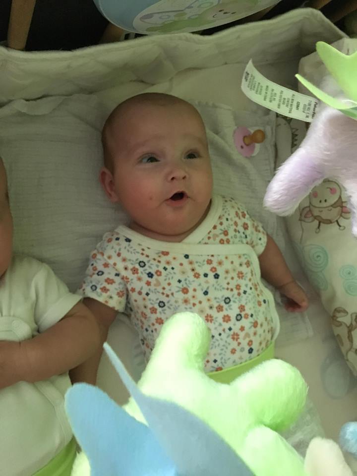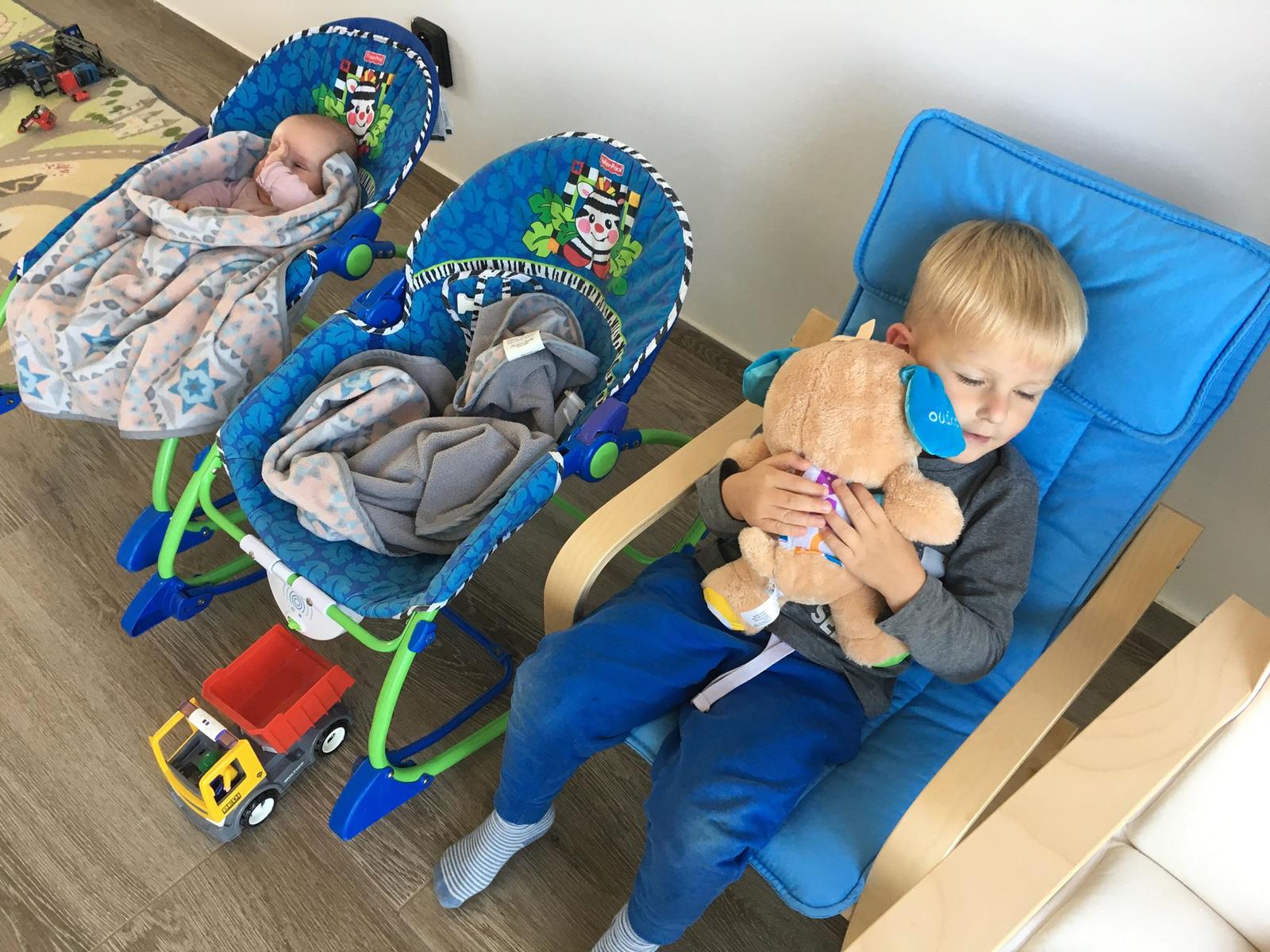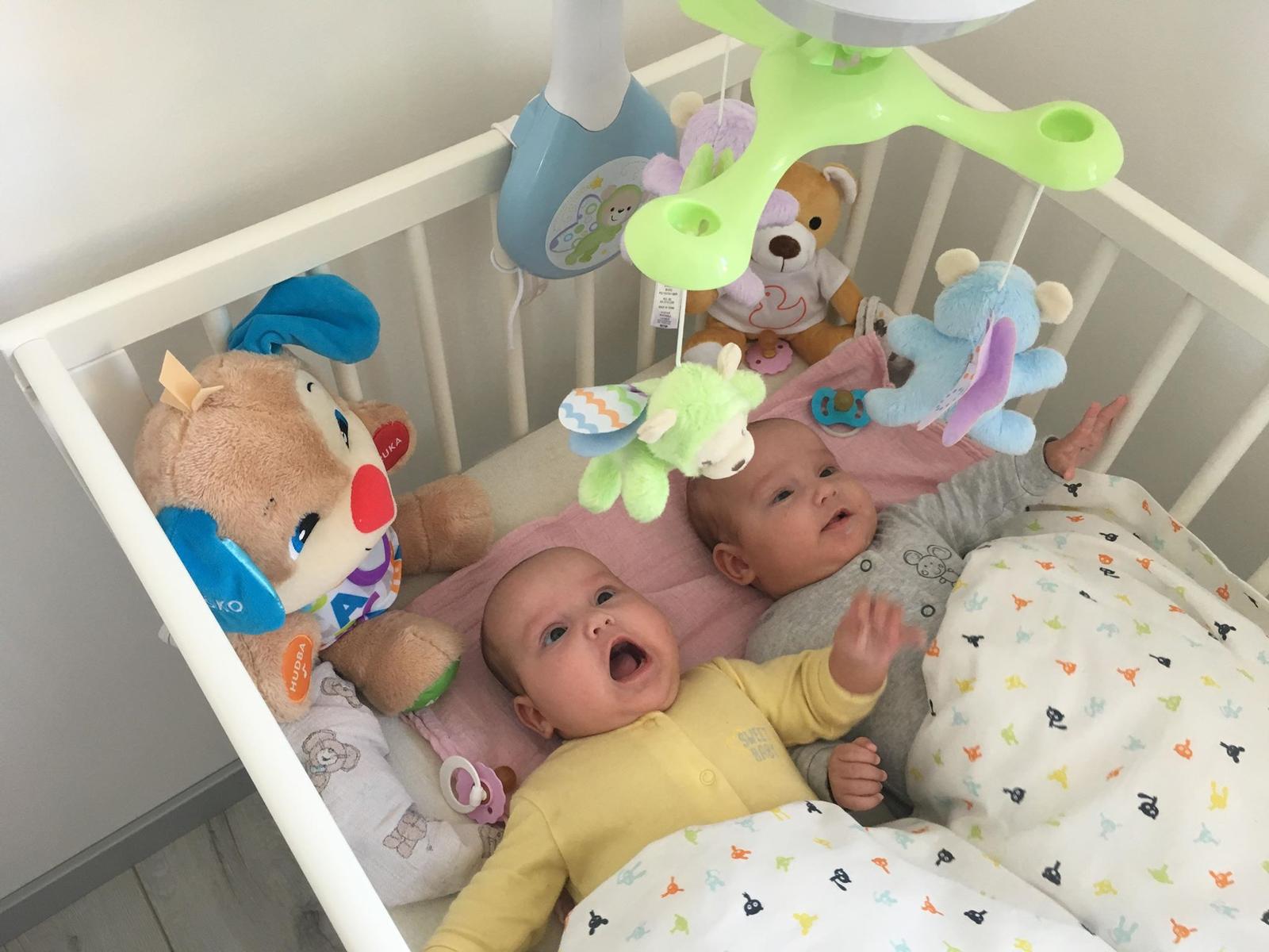Dorazila dopravní služba s dvěmi balíčky!! Juchůůůůůů. Odpoledne jsem vyzvedla s dvojčátky toho našeho čtyčleťáka ze školky a jako velký brácha dárky holkám rozbalil a ukázal. Nejen, že zaujali i FLORYHO, ale i holčičky. SOFINCE a OLIVCE jsou 4 měsíce bio a 2 měsíce korigo. Holčinky už měli kolotoč po Florym, ale bez funkce. Ten dostal kolotoč kolem roku od babičky a dědy. Ale jak už si stoupal kolotoč dostal co proto a každou chvilku končil strhnutý v postýlce a tak nefungoval. Tak ho holky měly jen jako "oční poutač nad postýlkou".