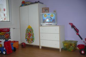Tohle je zatím provizorní pokojíček pro naše dva klučíky. Skříň, komodu, stoleček se židličkama a postel jsme koupili od kamarádky za 3000,- a časem chceme pořídit novej...bohužel teď, co jsme si naježili pod letošní vánoční stromeček 3+1 jsme rádi i za takový skromný pokojík🙂