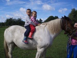 Foto z dnešní návštěvy u nás. Moje neteř Johanka - 2,5 roku, synovec Otík 5 let a kamarádka se svou neteří Aničkou 5,5 roku. Přijeli se povozit na koníkách... ;o)